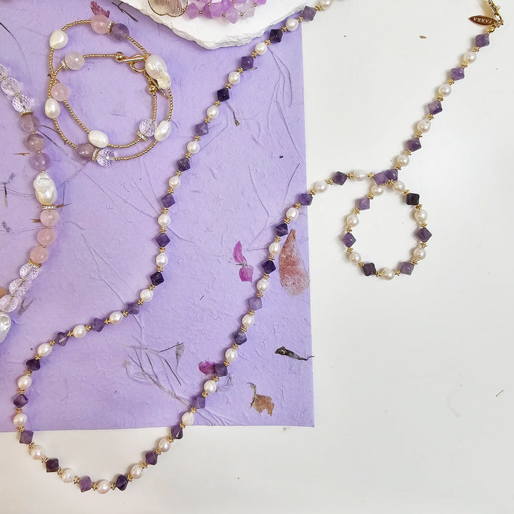This necklace features freshwater pearls and amethyst stones.