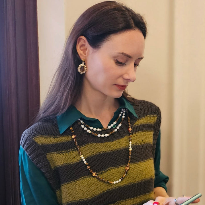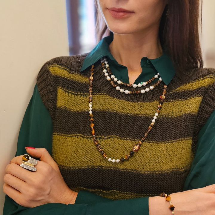 The Freshwater Pearls With Tiger Eye Double Layers Necklace by Farra is an exquisite piece that combines lustrous freshwater pearls and striking tiger eye stones. The double-layer design adds depth and versatility, while the tiger eye stones promote confidence and clarity and the pearls symbolize purity and wisdom. This necklace is a perfect gift.