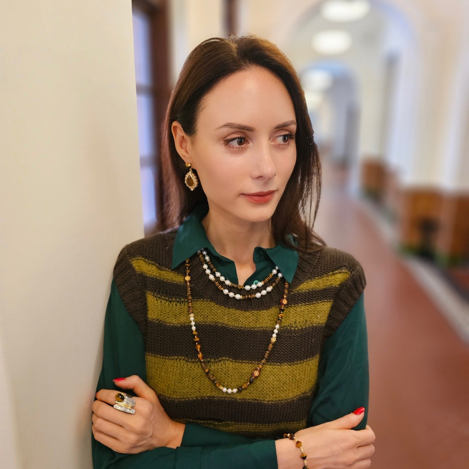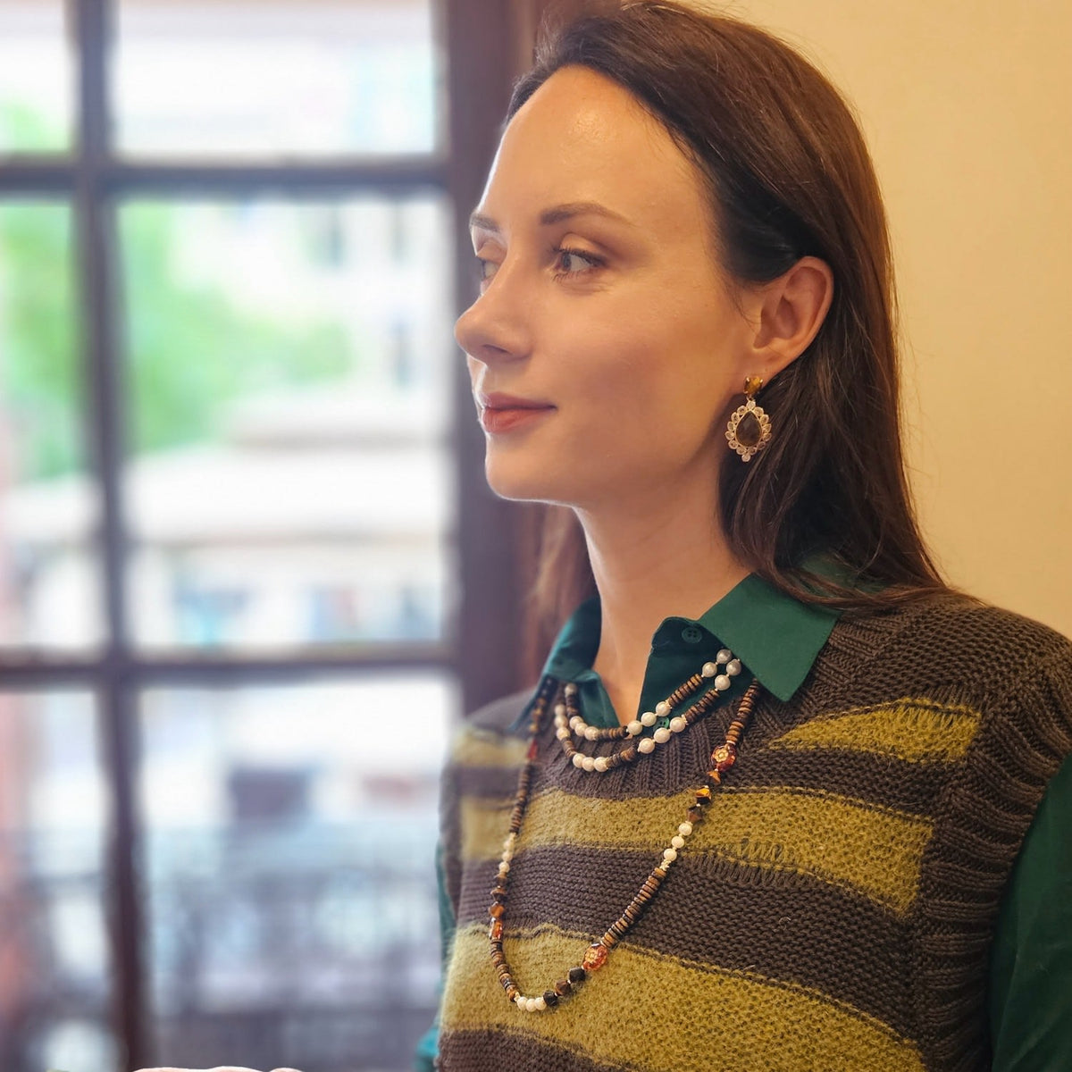 This necklace features freshwater pearls and natural tiger eye stones. The metal is 14K gold plated brass.