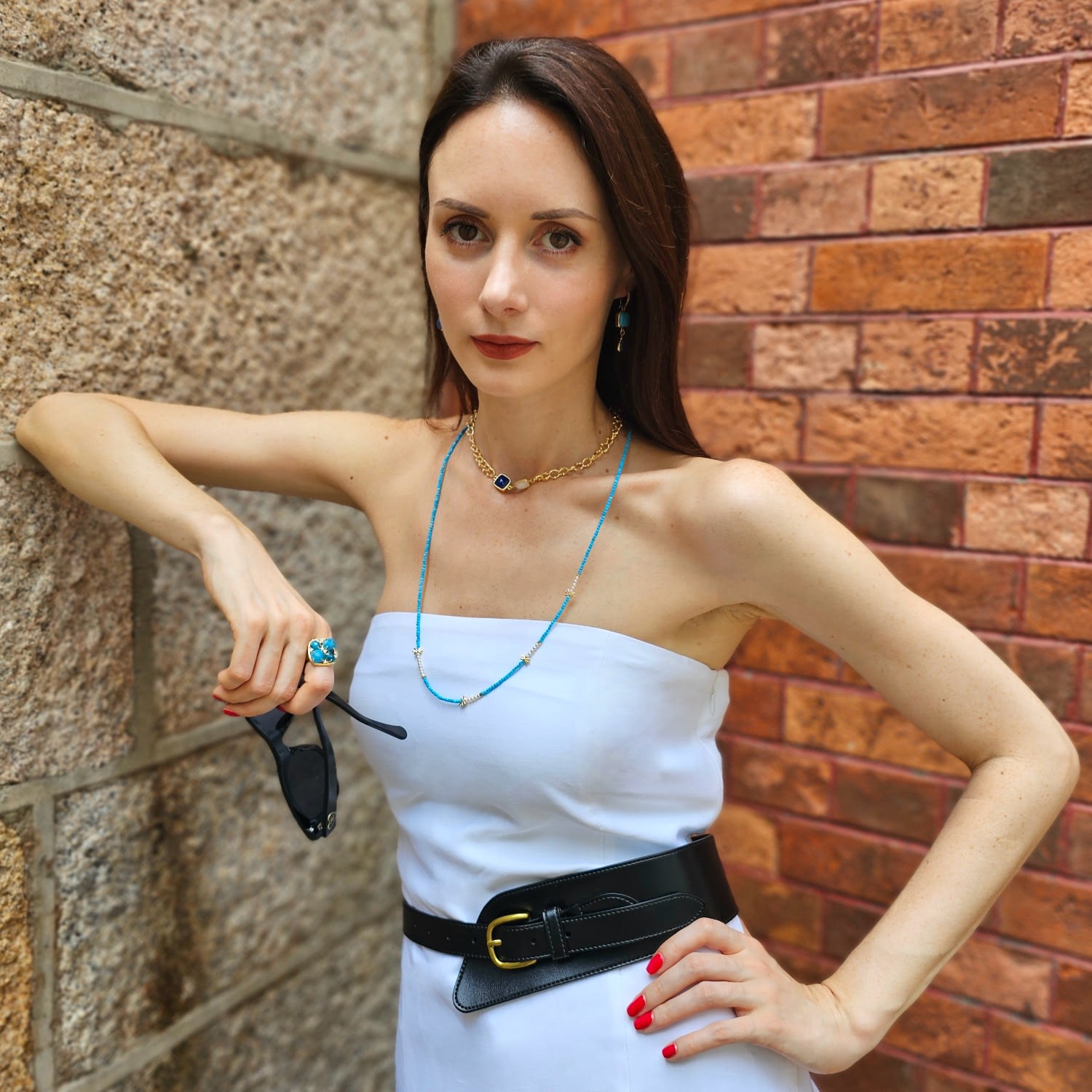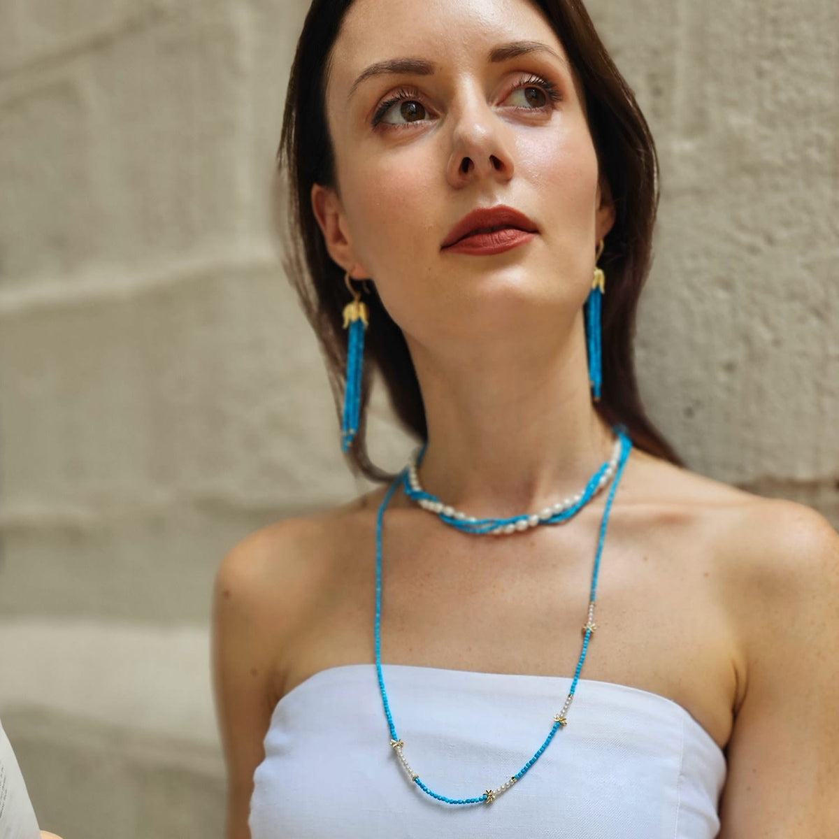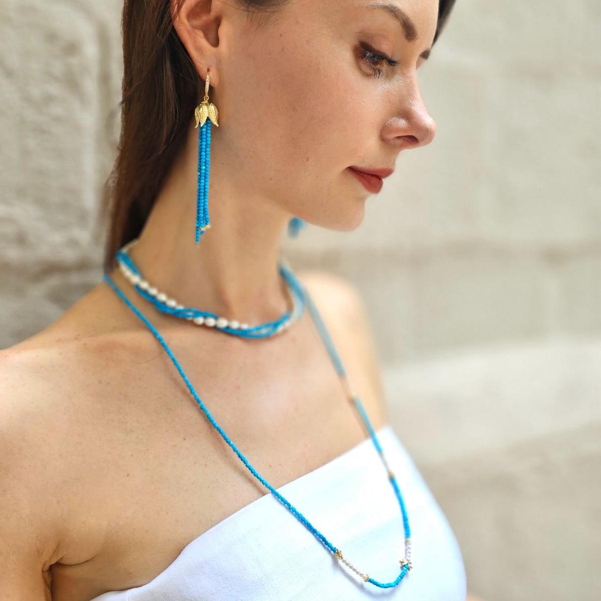 This Natural Blue Turquoise Minimalist Long Necklace by Farra is a beautiful piece that embodies lightness and timeless elegance. The combination of vibrant blue turquoise and lustrous freshwater pearls creates a refined yet understated aesthetic. The minimalist design allows the natural beauty of the stones to take center stage. This versatile necklace can be worn alone for a chic, effortless look or layered for a more dynamic style.