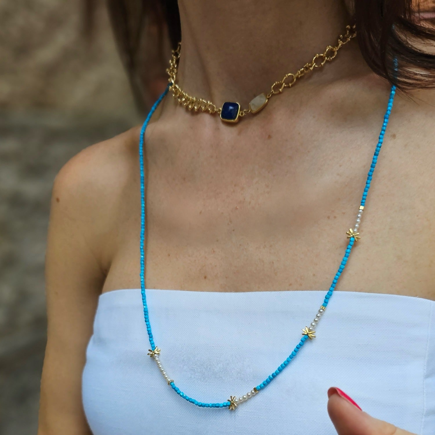 This necklace is made with natural blue turquoise, freshwater pearls, and 14k gold-plated brass.