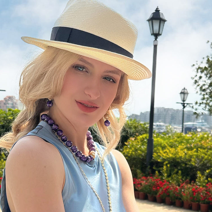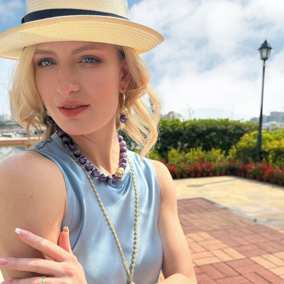 This Gorgeous Amethyst With Baroque Pearls Chunky Necklace by Farra is a beautiful and timeless piece. The stunning, large Baroque pearl, with its unique shape and luster, is complemented by a faceted Amethyst stone. Amethyst, the birthstone of February, is known for promoting spiritual growth and providing a calming effect. This necklace is a must-have, perfect for both formal occasions and everyday wear, adding a touch of glamour and sophistication.