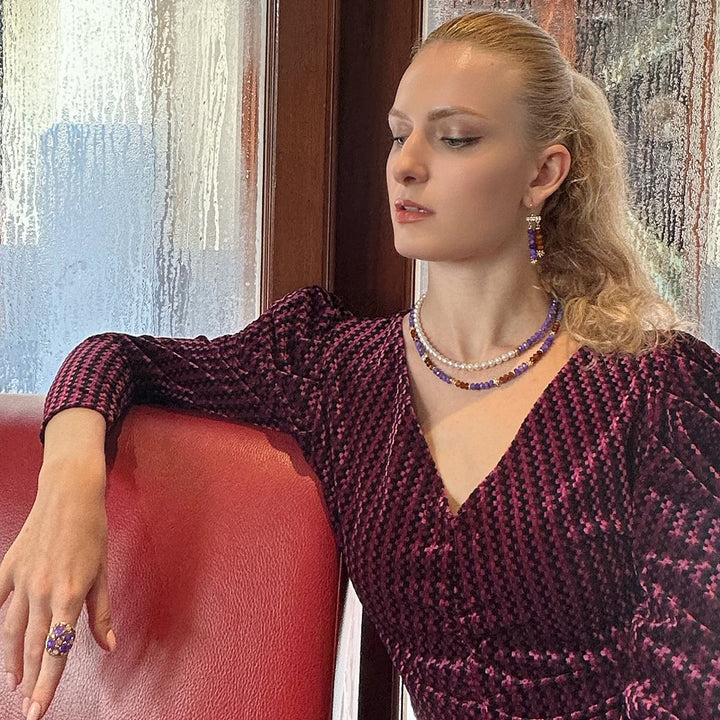 This Amethyst With Orange Garnet Color Blocking Choker by Farra is a sophisticated and stylish statement piece. The striking combination of natural amethyst and natural orange garnet creates a chic color-blocked look that transitions effortlessly from day to night. Amethyst is believed to promote calmness and spiritual growth, while garnet is associated with passion and courage, making this necklace both a beautiful and meaningful accessory.