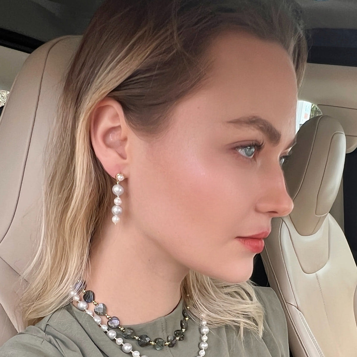 These earrings feature white and gray natural cultured freshwater pearls. They are set on 14k gold-plated brass.