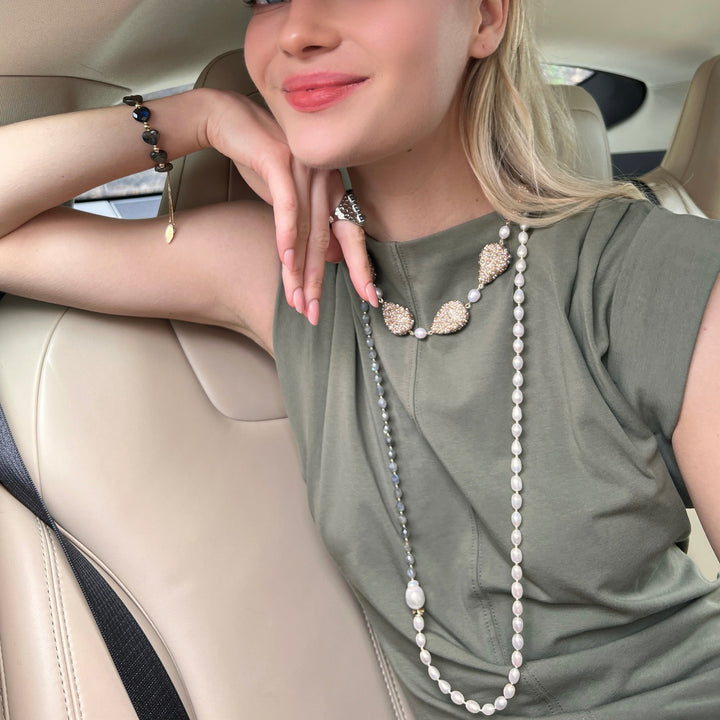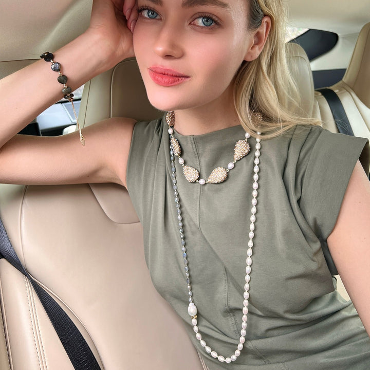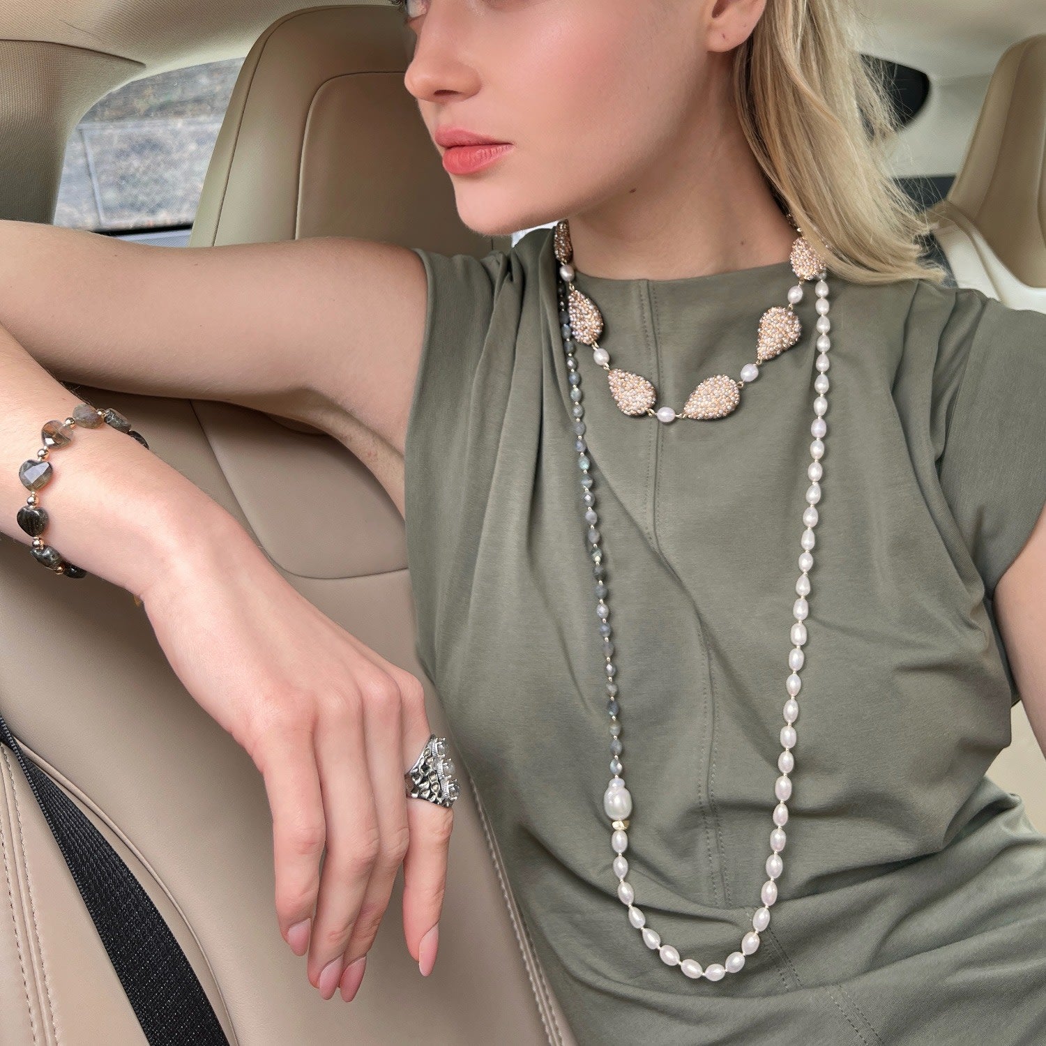 This Gray Labradorite With Freshwater Baroque Pearls Long Necklace by Farra is a graceful and elegant piece that celebrates the artistry of nature. It features gray labradorite gemstones known for their captivating play of colors and white freshwater pearls with a luminous glow. The unique, naturally formed Baroque pearl pendant adds a captivating focal point, ensuring each necklace has its own distinct character.