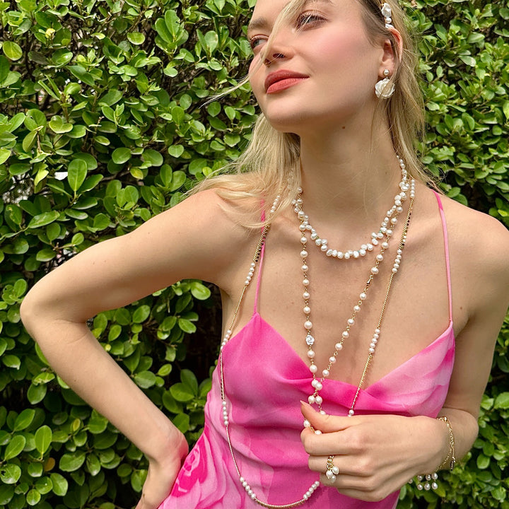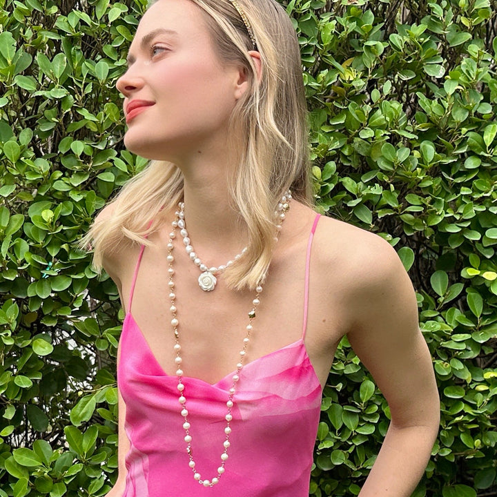 The Timeless Freshwater Pearls With White Rose Flowers Long Necklace by Farra is a beautiful and versatile accessory. This long necklace showcases lustrous natural cultured freshwater pearls with delicate white rose flower charms. It can be worn as a single long strand or doubled up for a layered look. The combination of pearls and flowers creates a harmonious blend of classic and contemporary aesthetics.