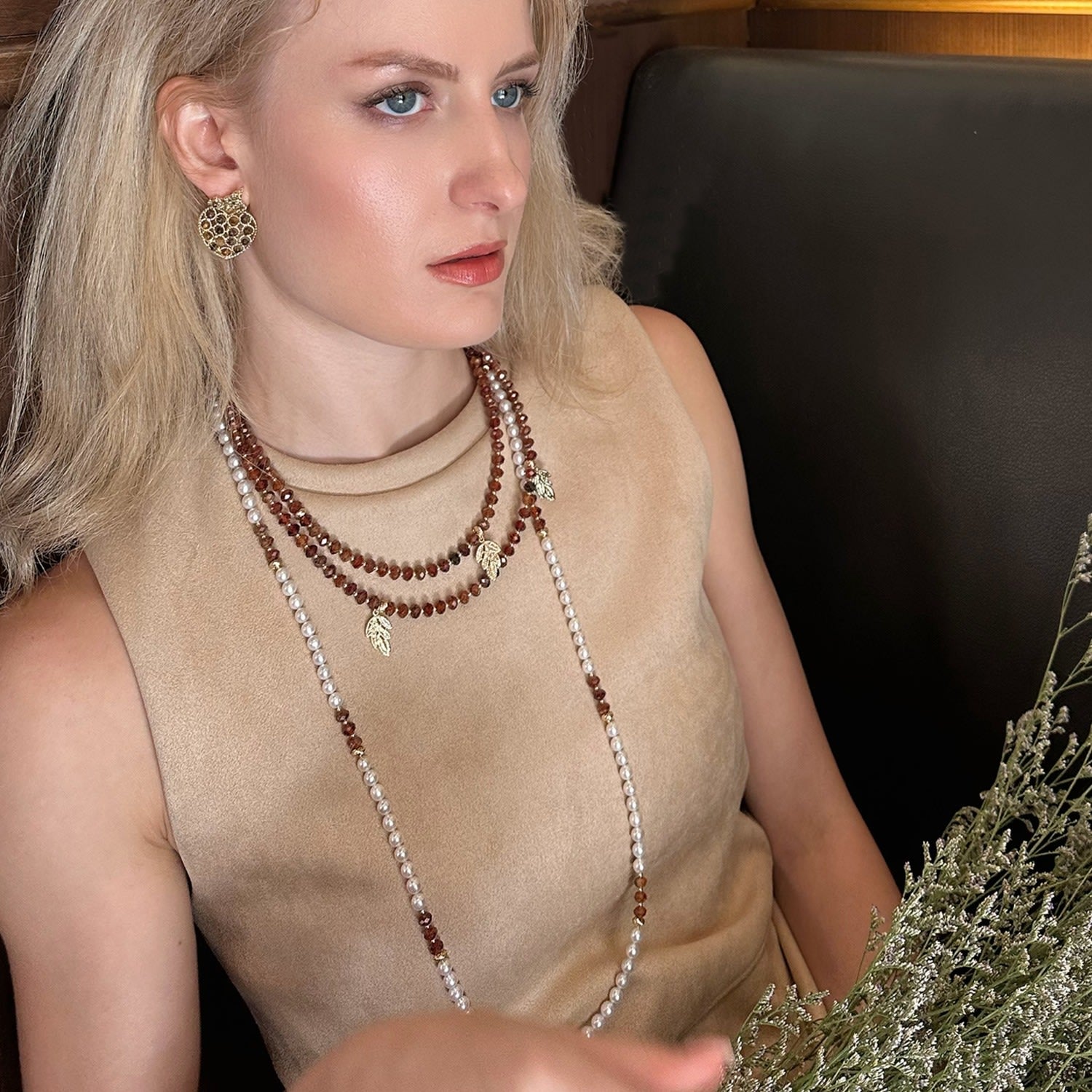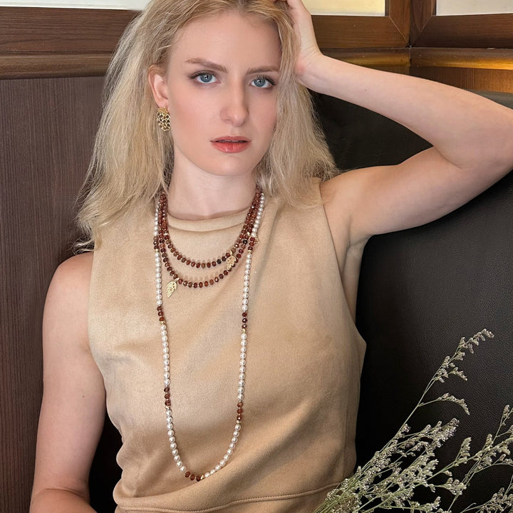 Freshwater Pearls With Orange Natural Garnet Long Necklace