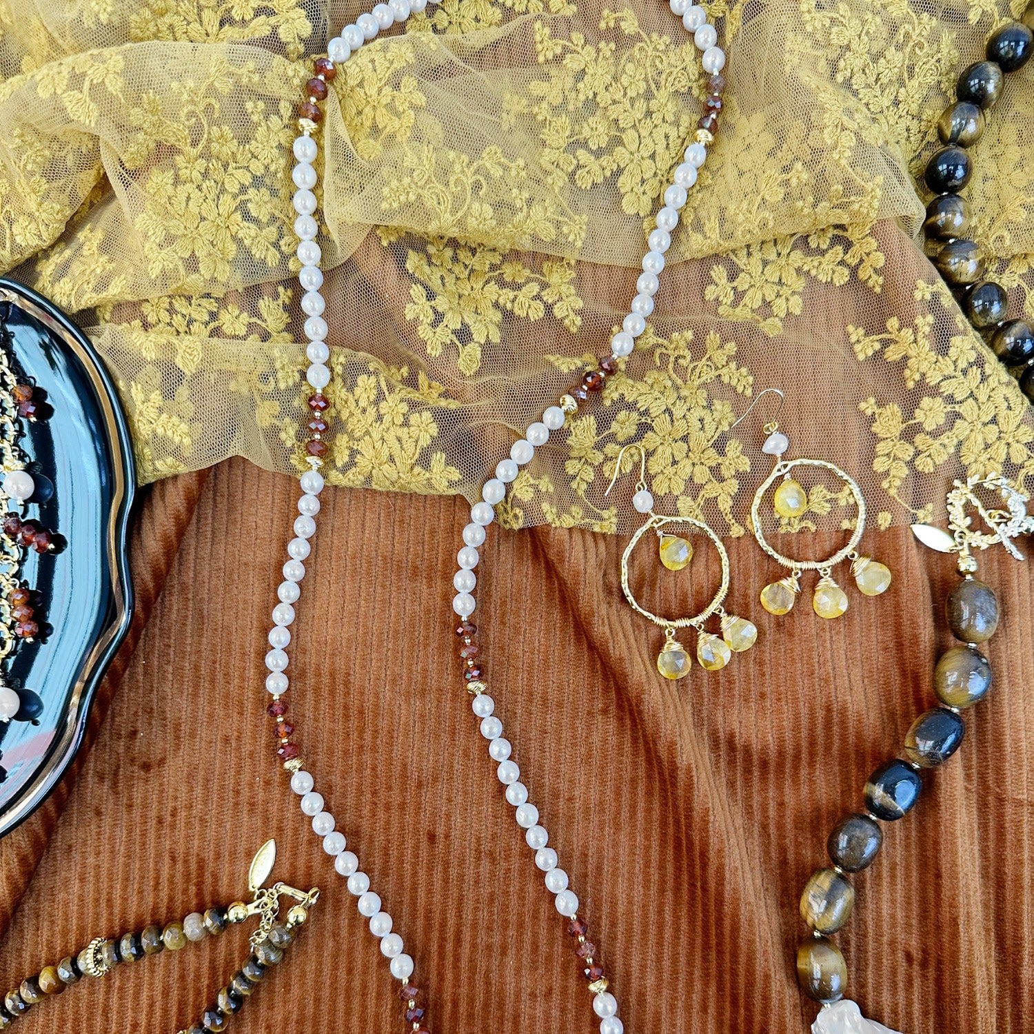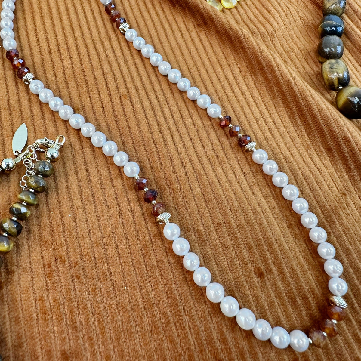 This long necklace is expertly crafted with freshwater pearls and vibrant orange natural garnet gemstones.