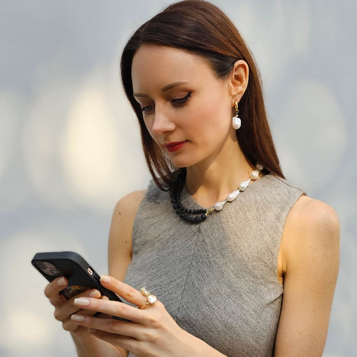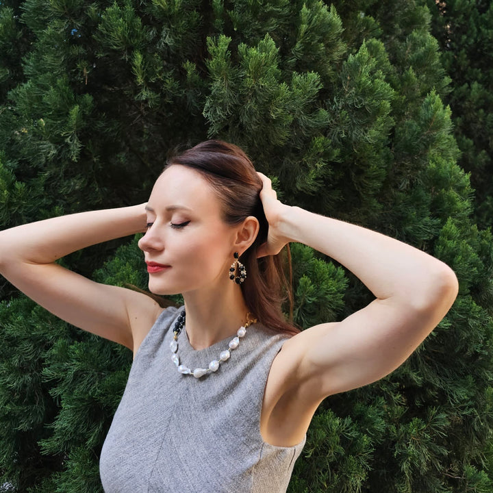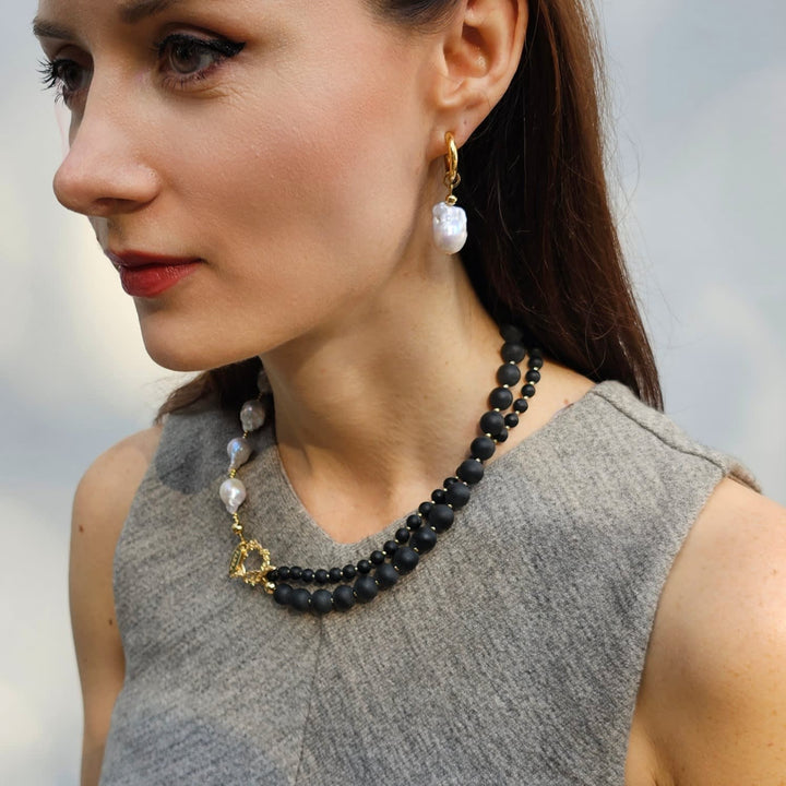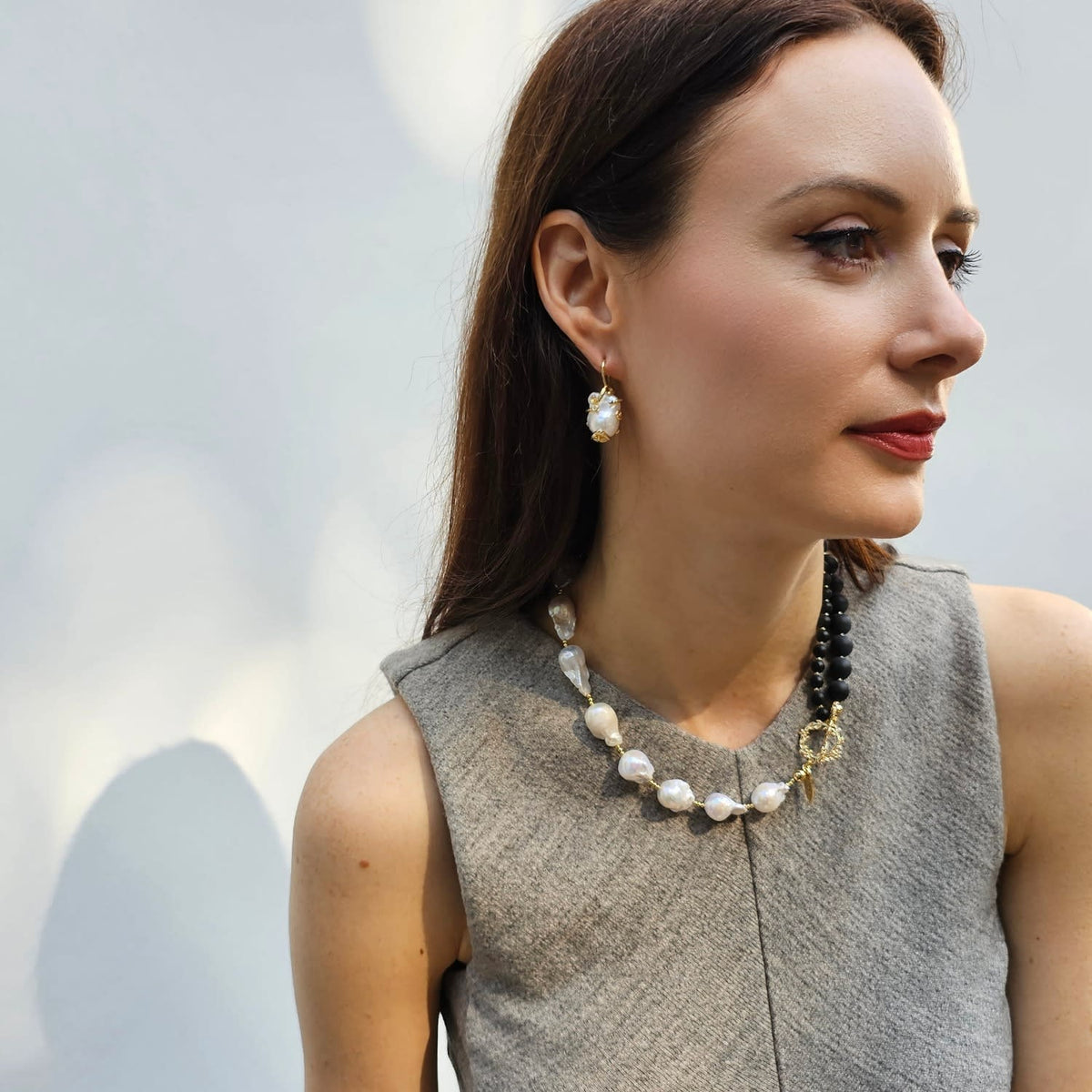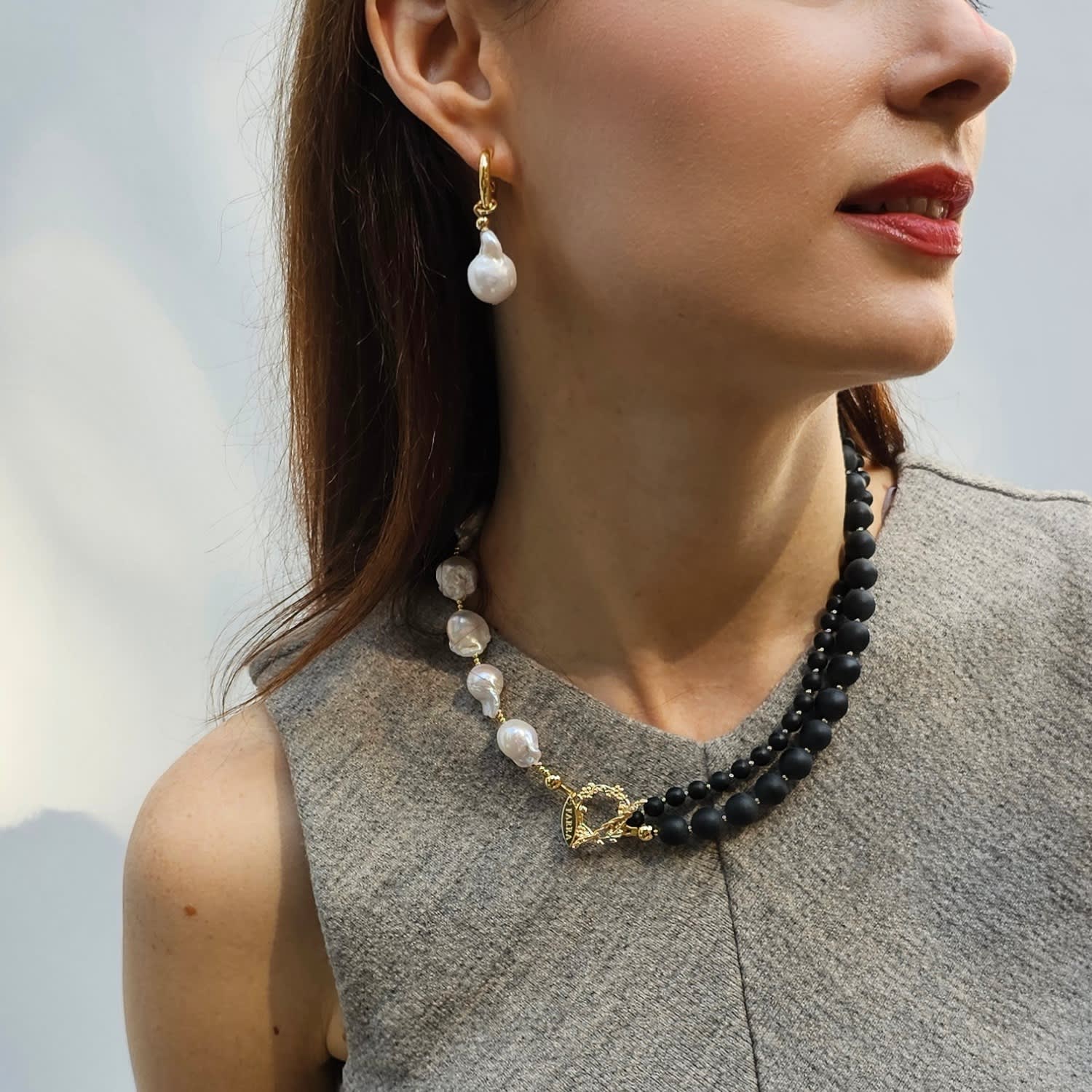 This Black Obsidian And White Baroque Pearls Necklace by Farra is a stunning fusion of elegance and strength. The necklace features lustrous white baroque pearls that beautifully contrast with the rich, dark tones of natural black obsidian, known for its protective qualities. The unique shapes of the pearls add individuality, while the obsidian provides a bold statement of sophistication, making it a versatile accessory for any occasion.