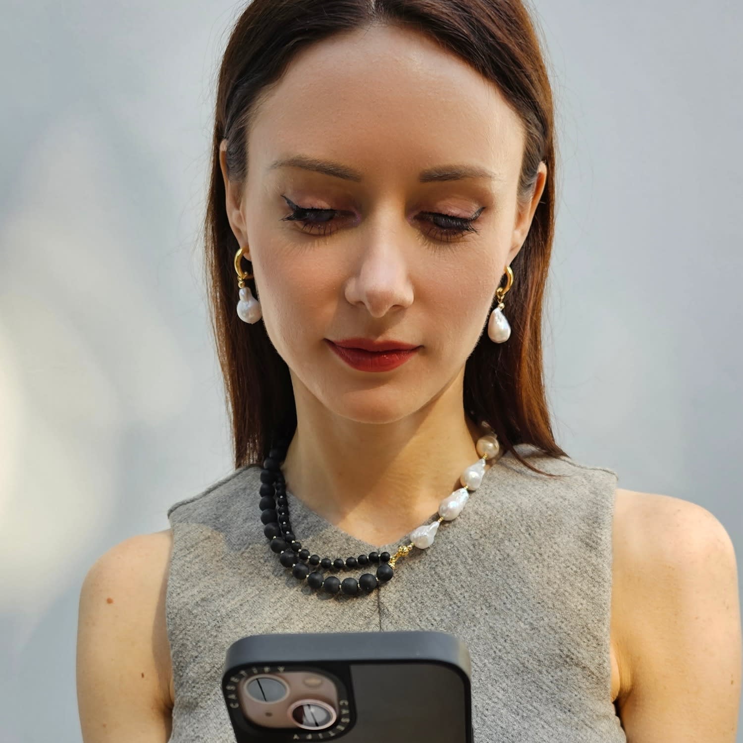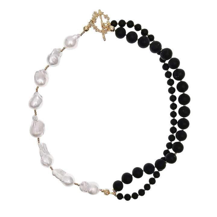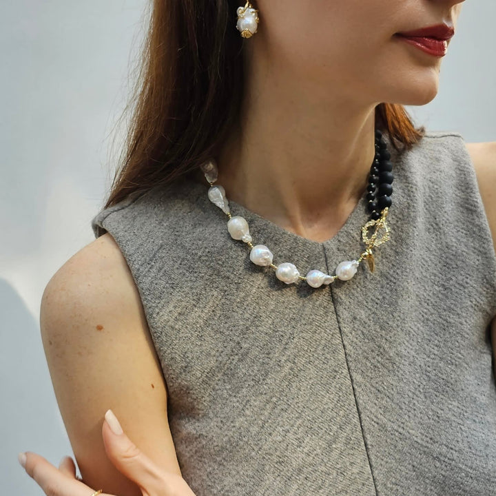 This necklace features natural black obsidian and white baroque pearls. The metal is not specified.