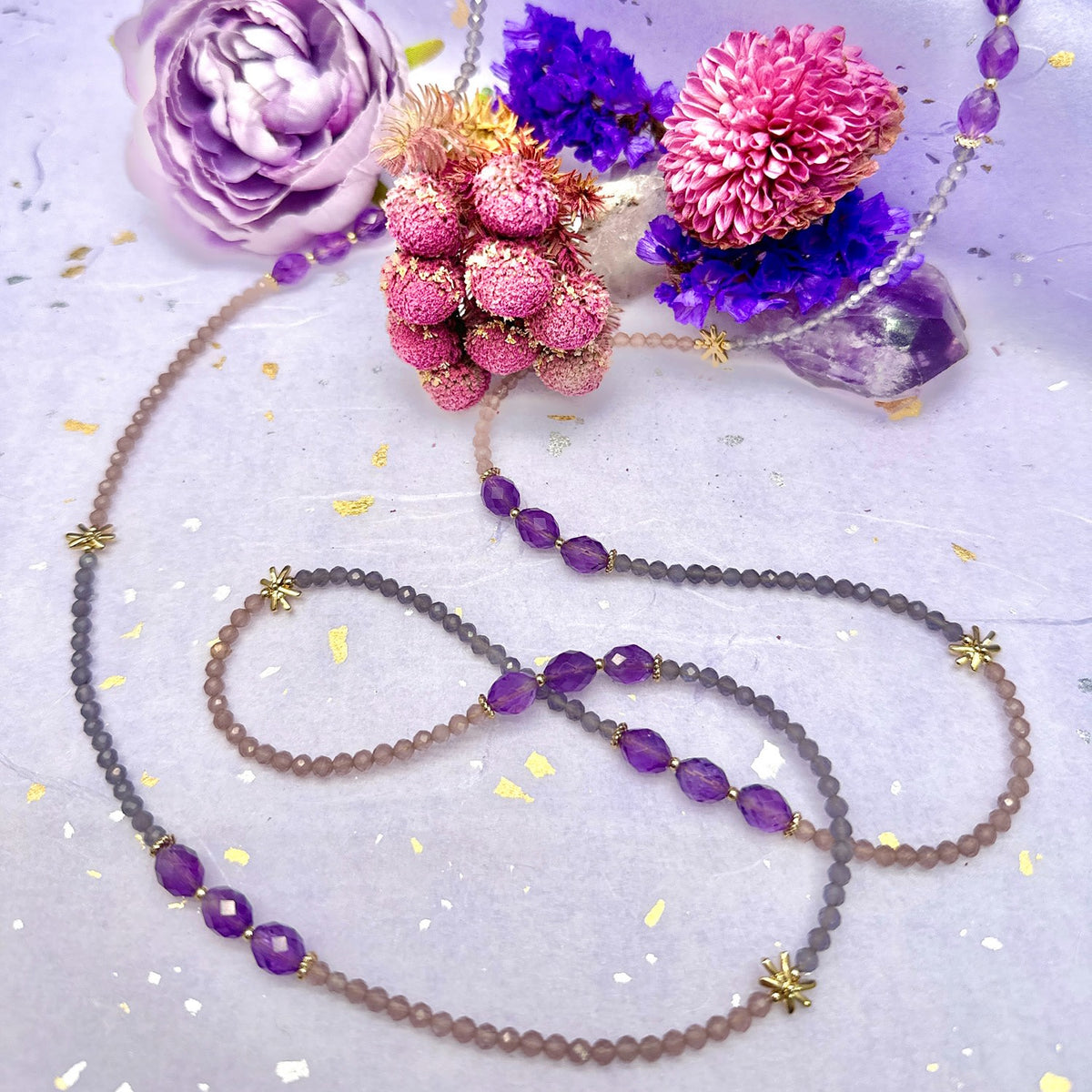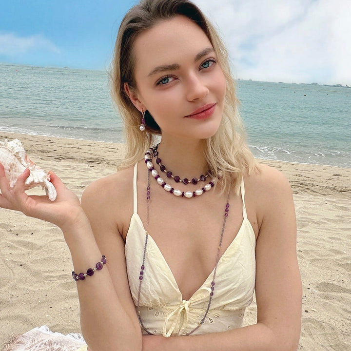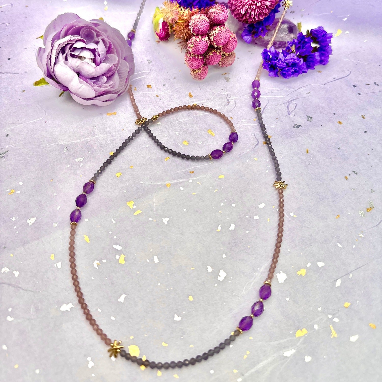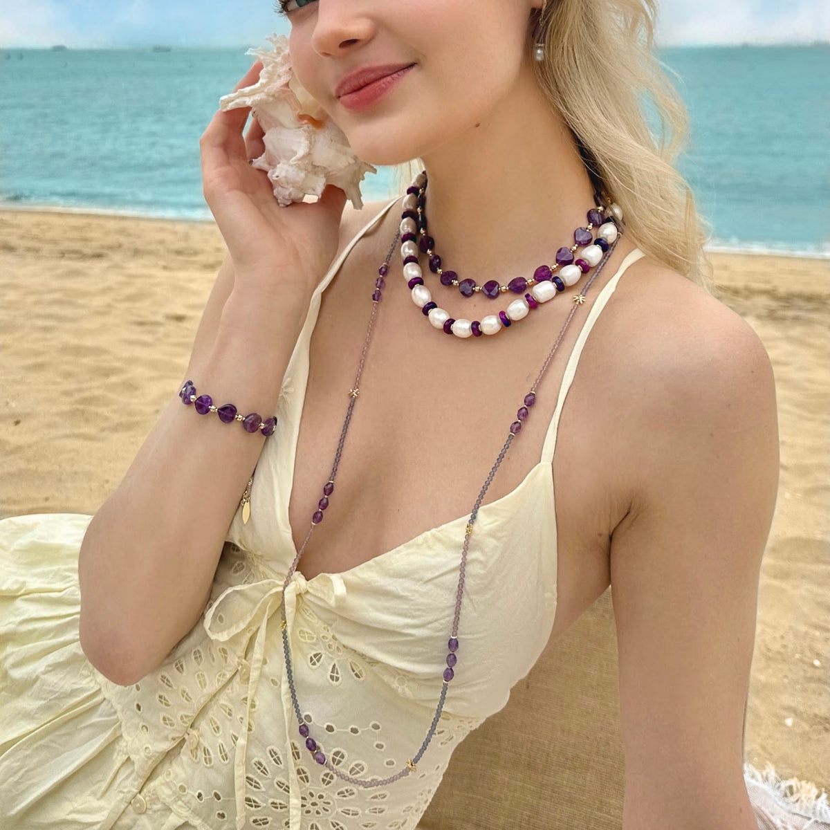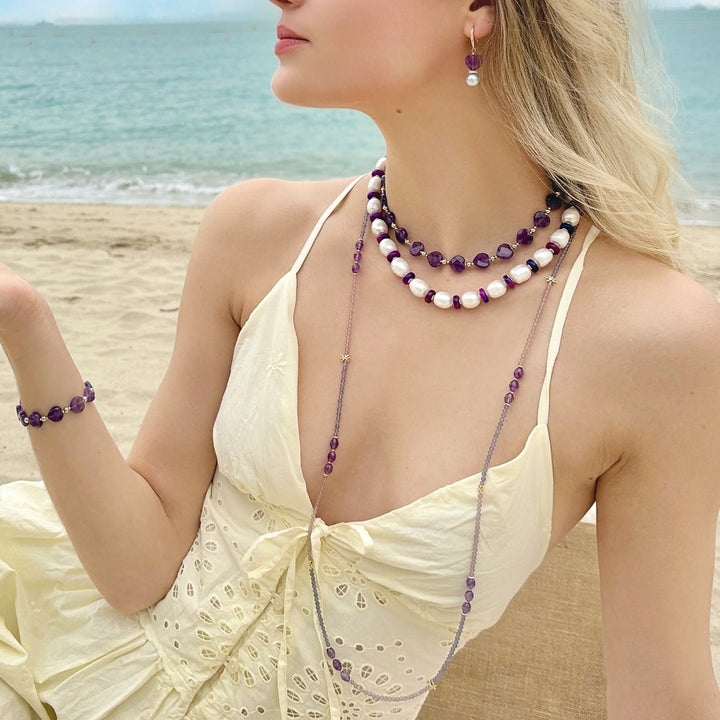 This Purple Gemstone Color Matching Versatile Long Necklace by Farra is a versatile and elegant piece. The necklace features a beautiful combination of natural orchid opal and purple amethyst, exuding femininity and sophistication. Its long, single strand can also be doubled up for a trendy layered look, allowing for effortless styling and versatility.