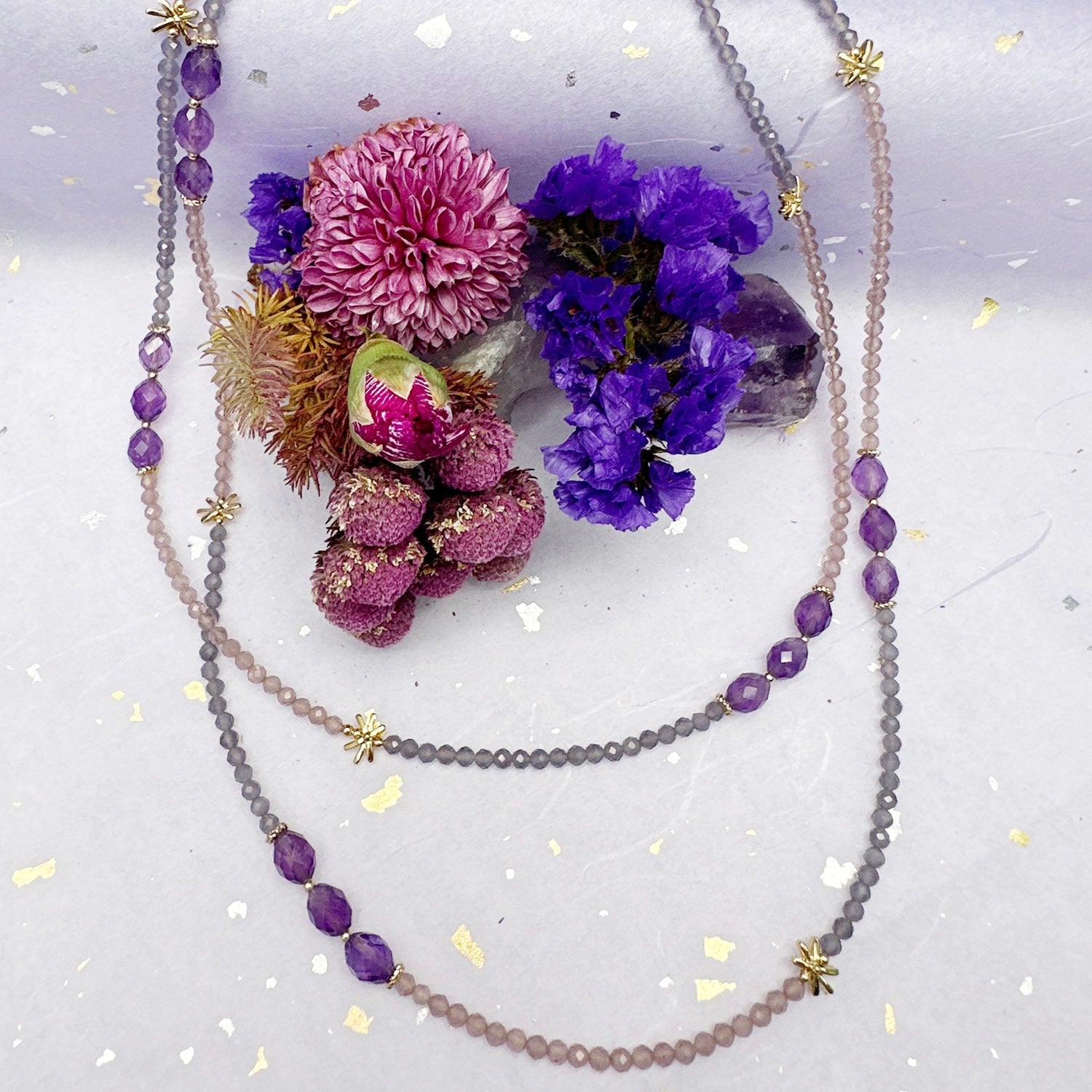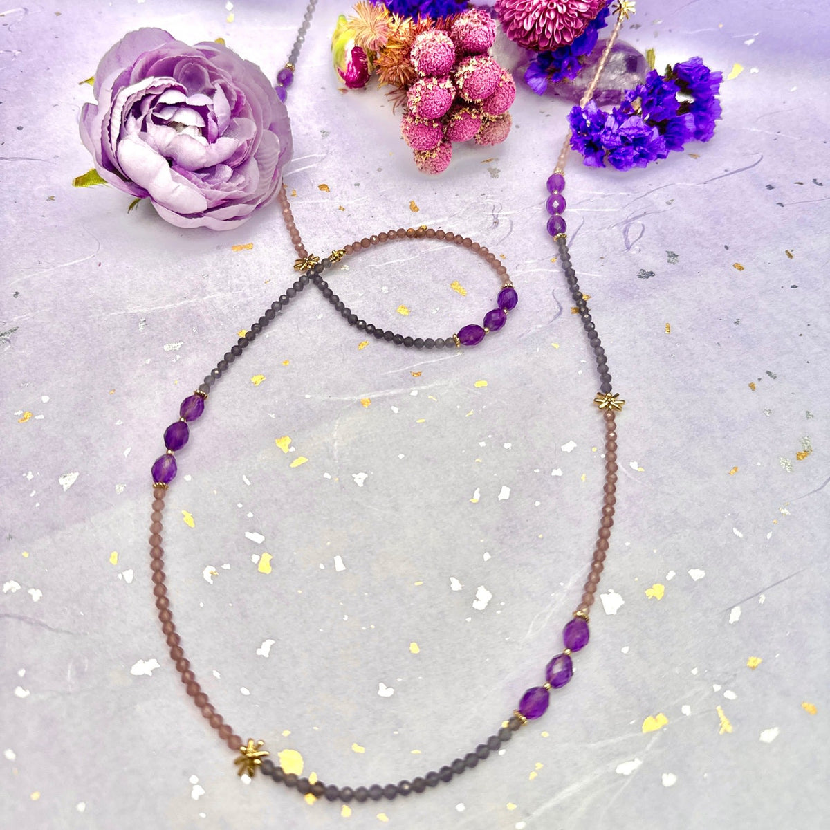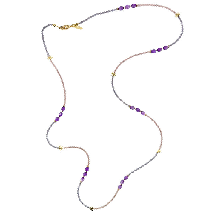 This necklace features natural orchid opal and natural amethyst gemstones. The chain is made of 14K gold-plated brass.
