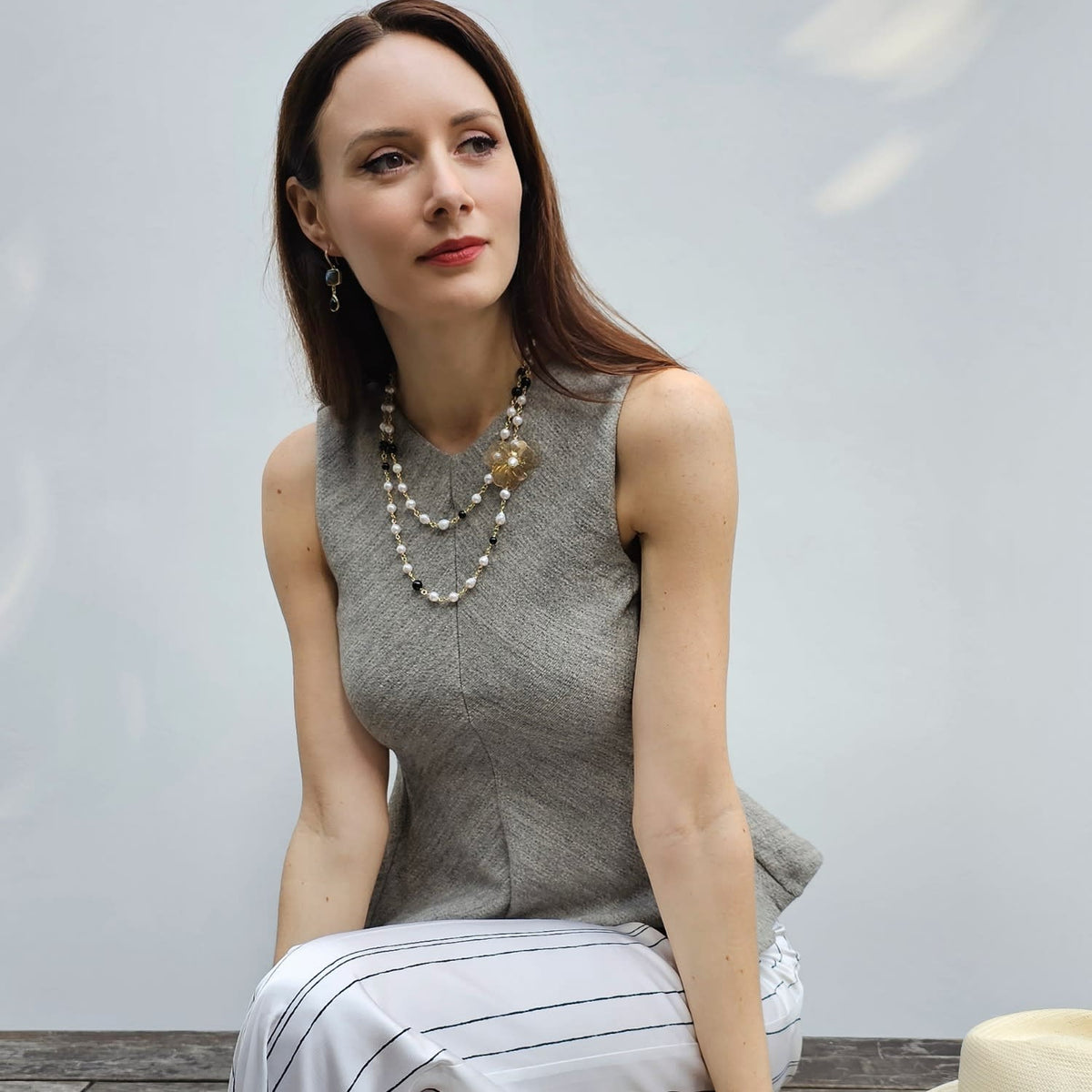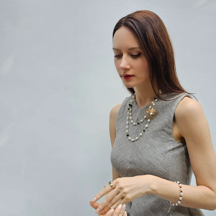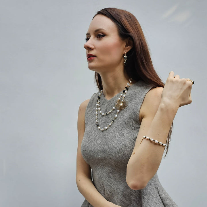 This Freshwater Pearls And Black Obsidian With Flower Charm Long Necklace by Farra is a stunning piece that blends classic elegance with a contemporary edge. The necklace features a captivating contrast between lustrous freshwater pearls and striking black obsidian. The delicate flower charm adds a whimsical touch, while its versatile length allows for single or double-layered styling.