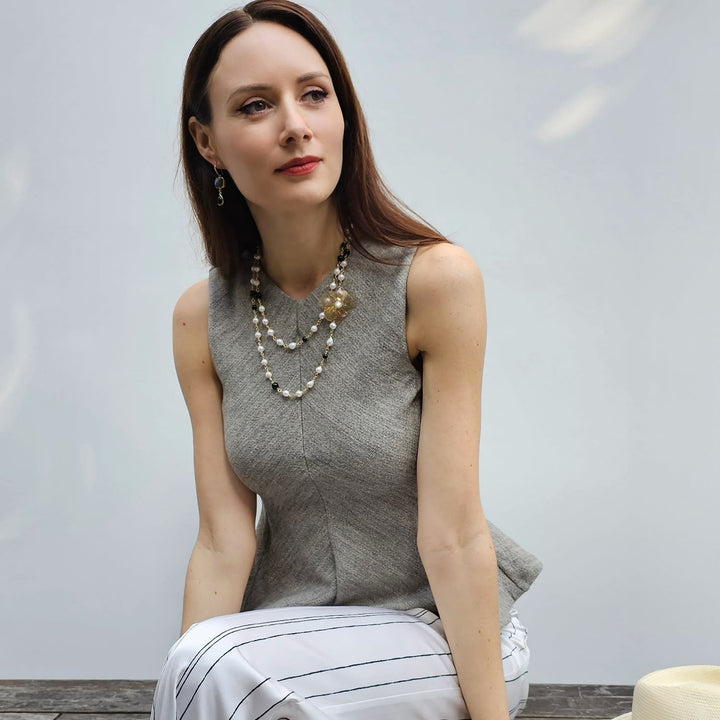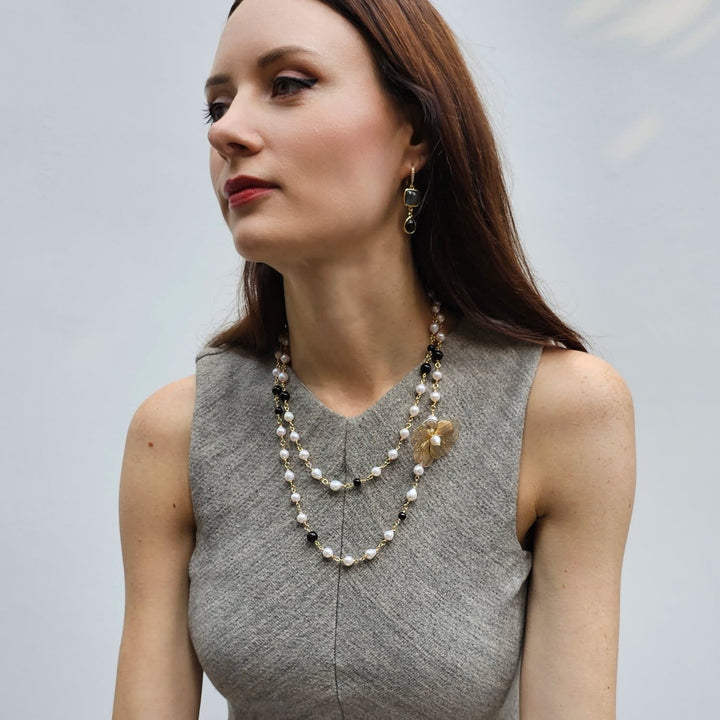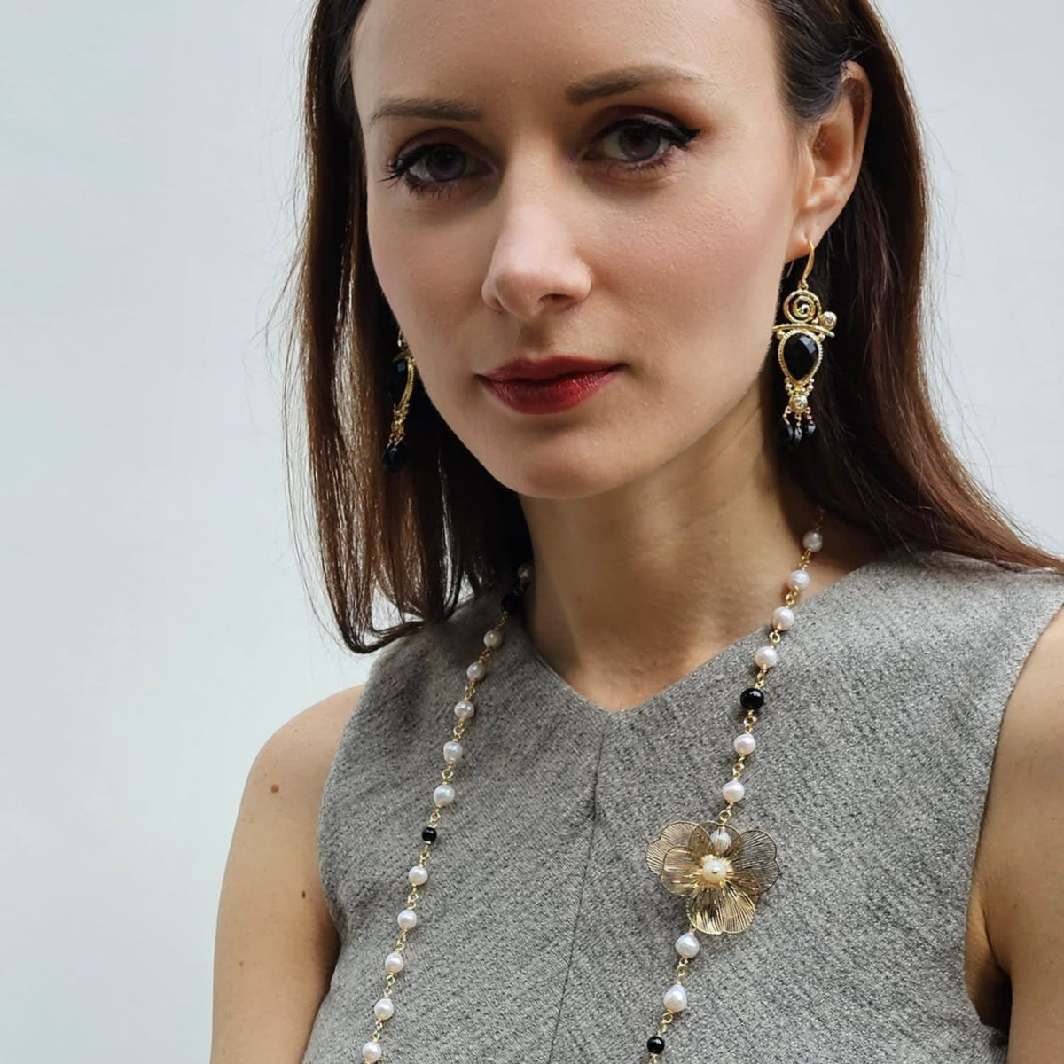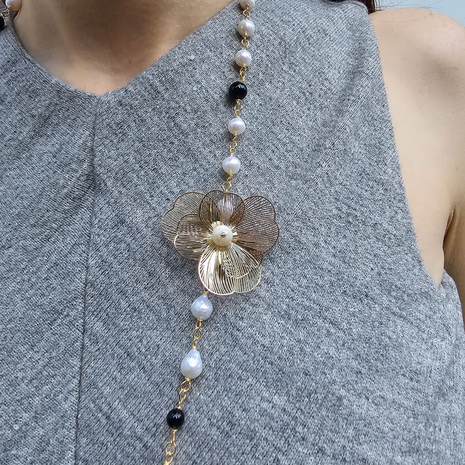 This necklace is made with natural freshwater pearls and black obsidian on a long chain. It features a delicate flower charm.