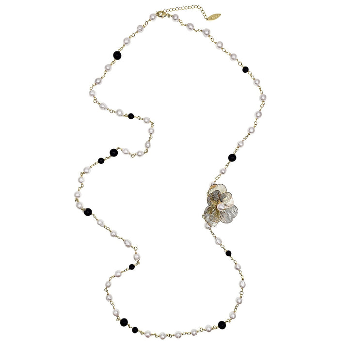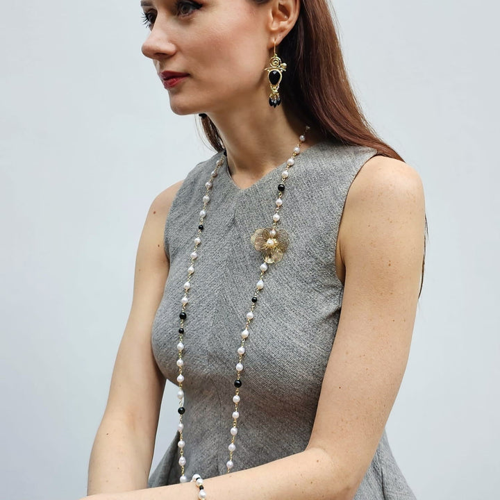 Freshwater Pearls And Black Obsidian With Flower Charm Long Necklace