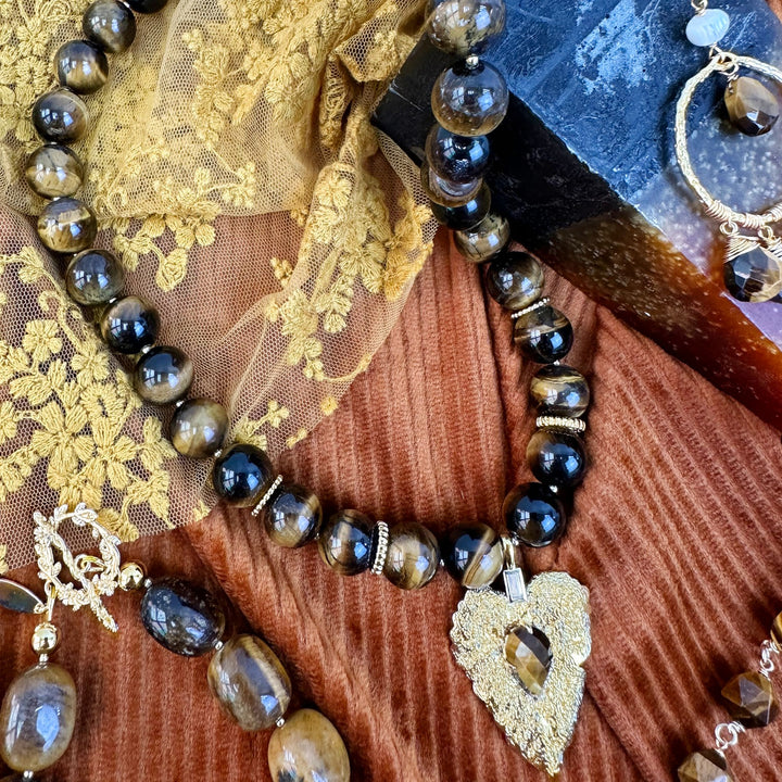 This chunky necklace features natural tiger eye stone and a leaf pendant, with gold plating on brass.