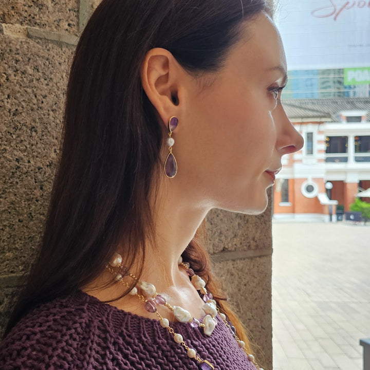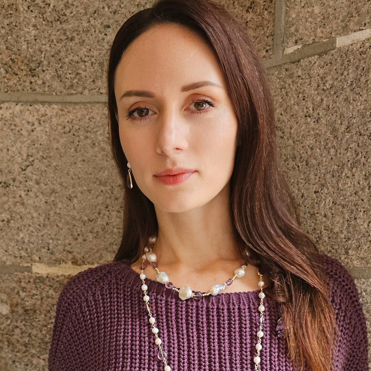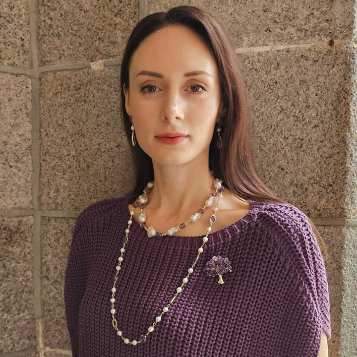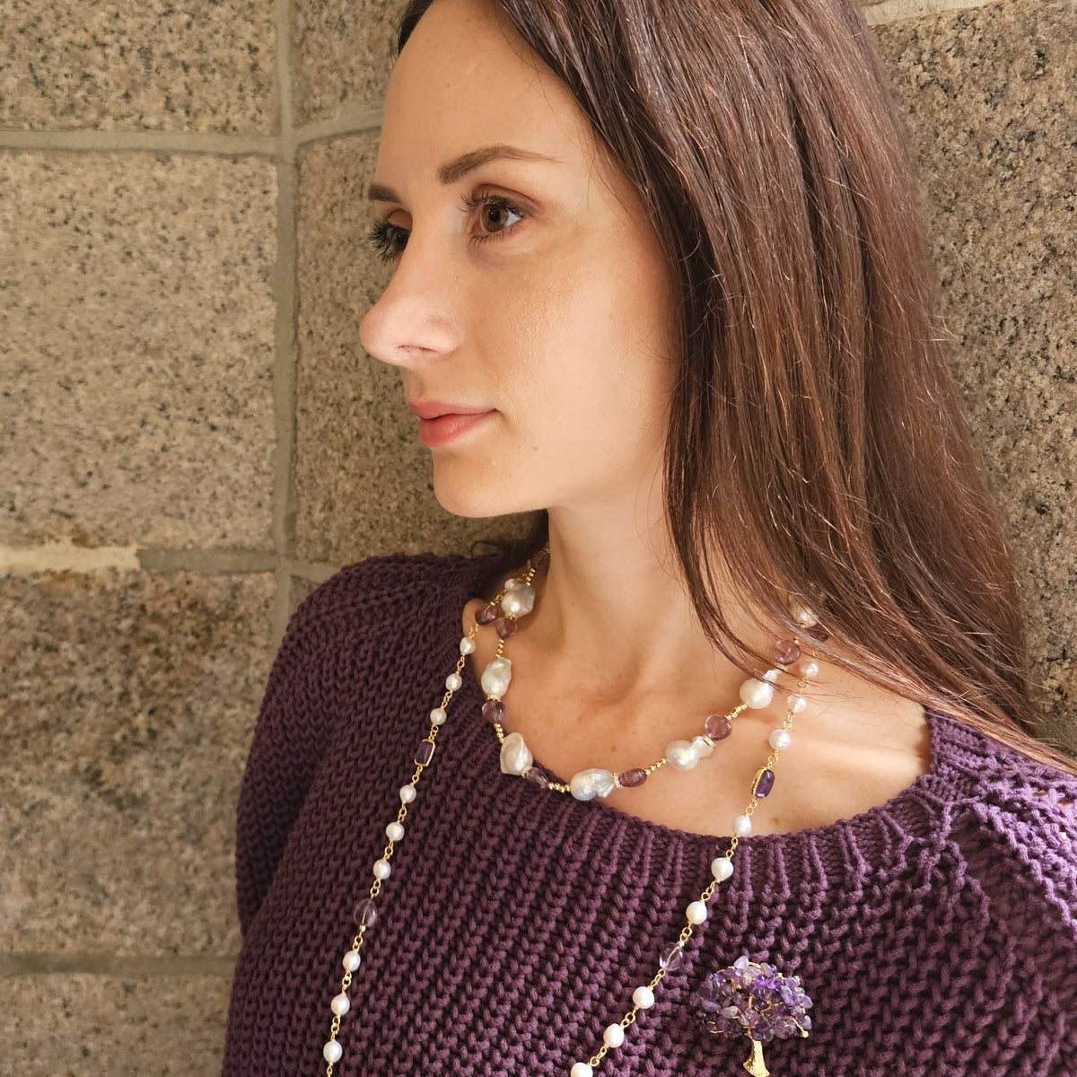 This necklace is made with natural baroque freshwater pearls, natural heart-shaped amethyst, and 14k gold-plated brass.