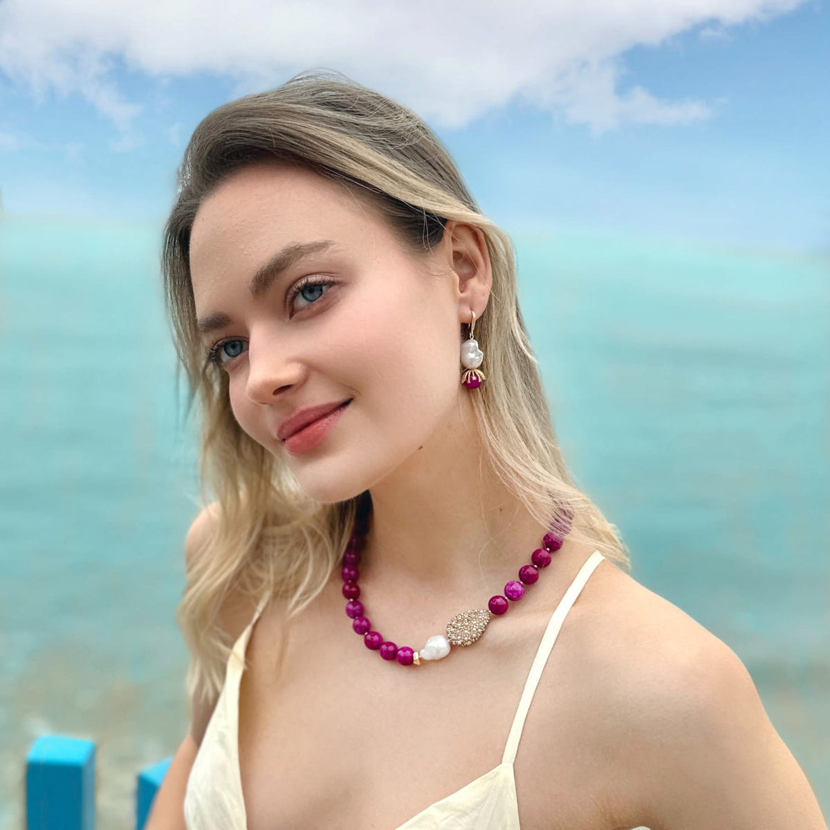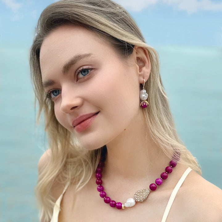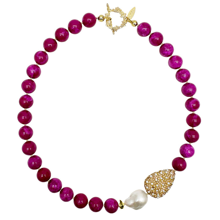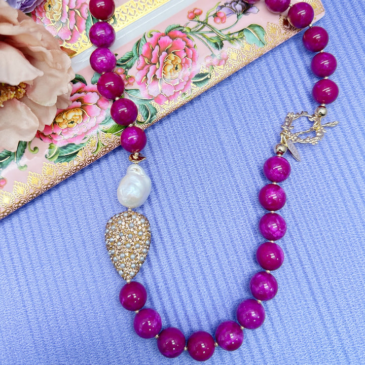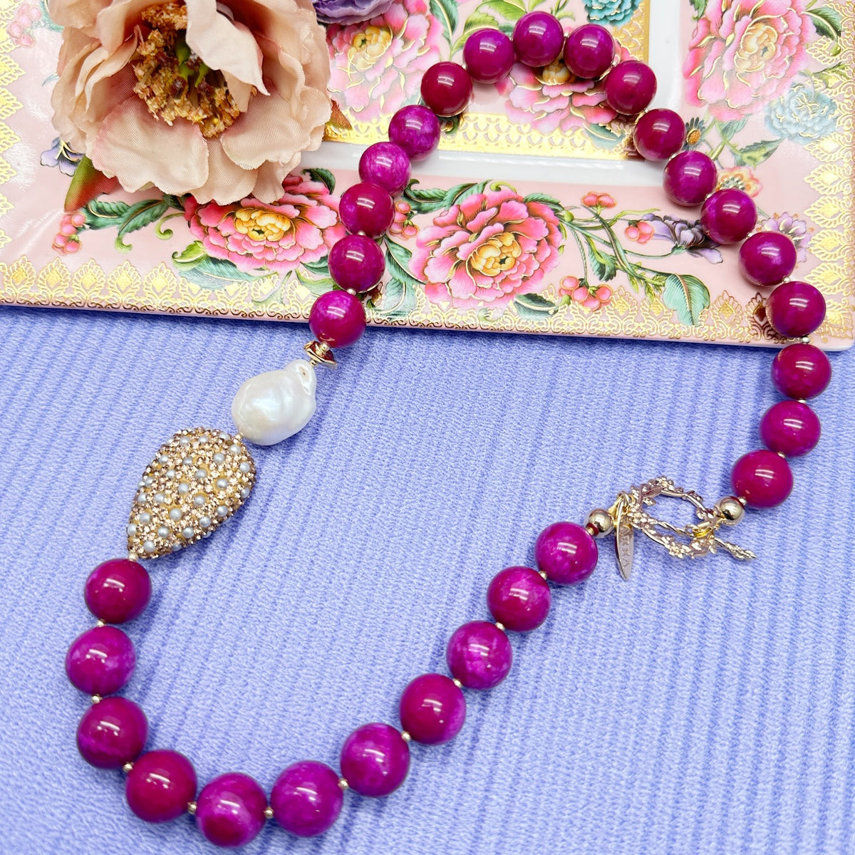 Magenta Gemstone With Baroque Pearl Pendant Statement Necklace