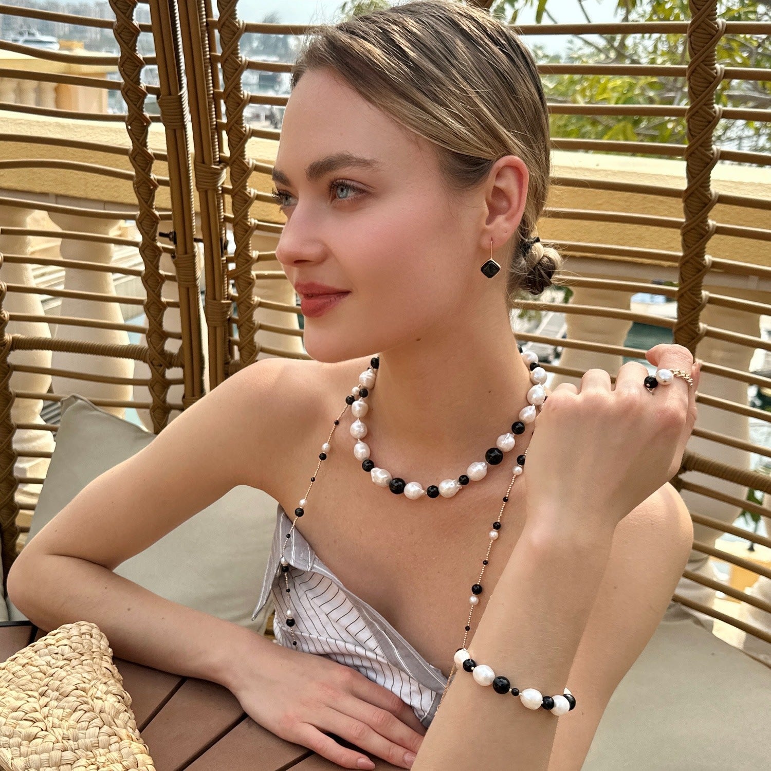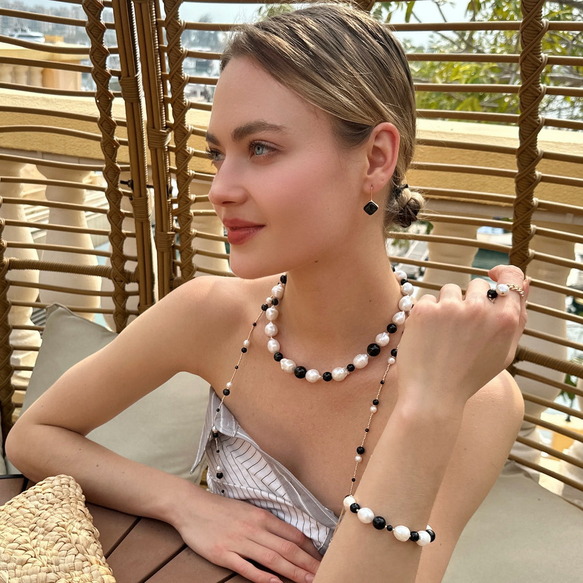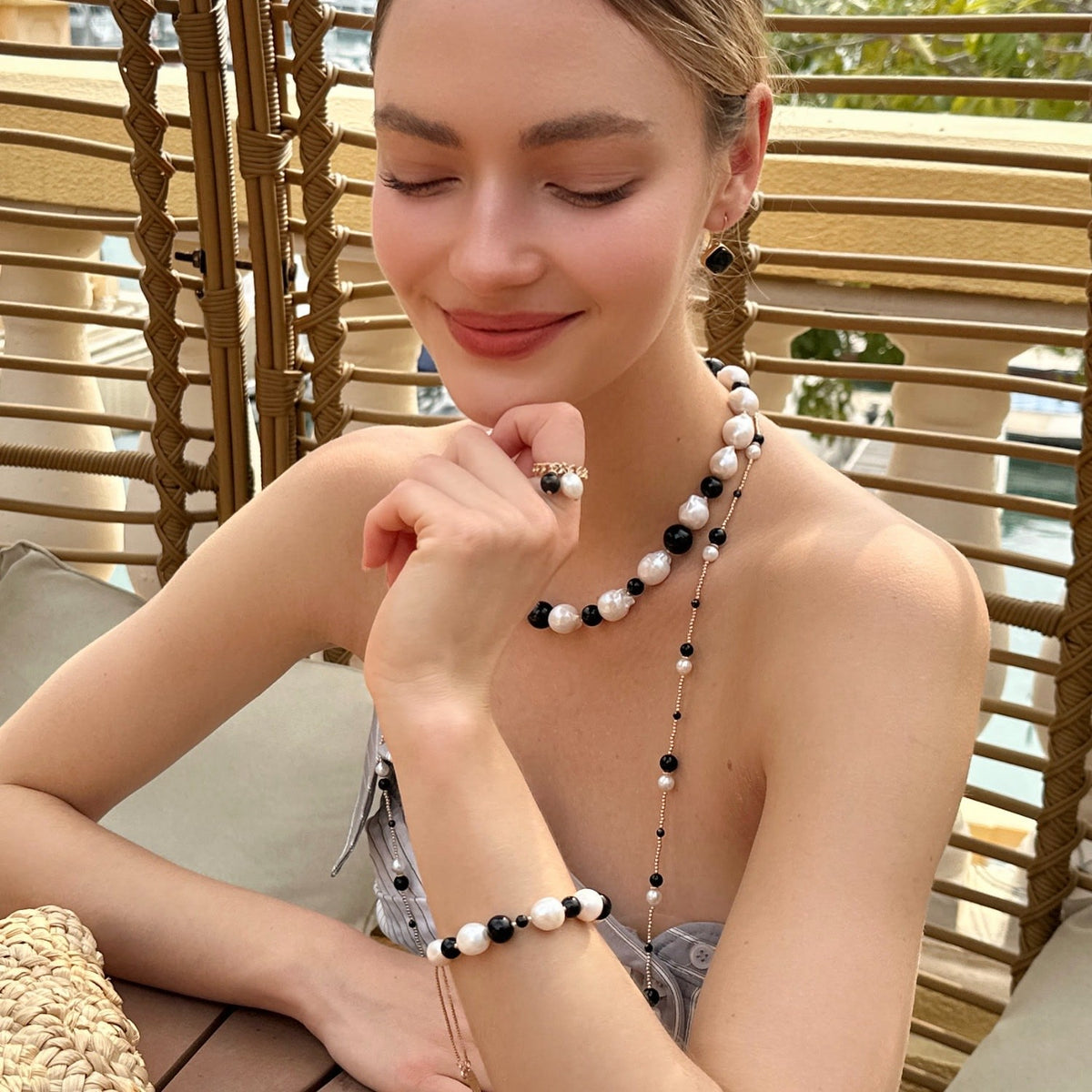 This adjustable bracelet features baroque pearls, natural black obsidian, and 14k gold-plated brass.