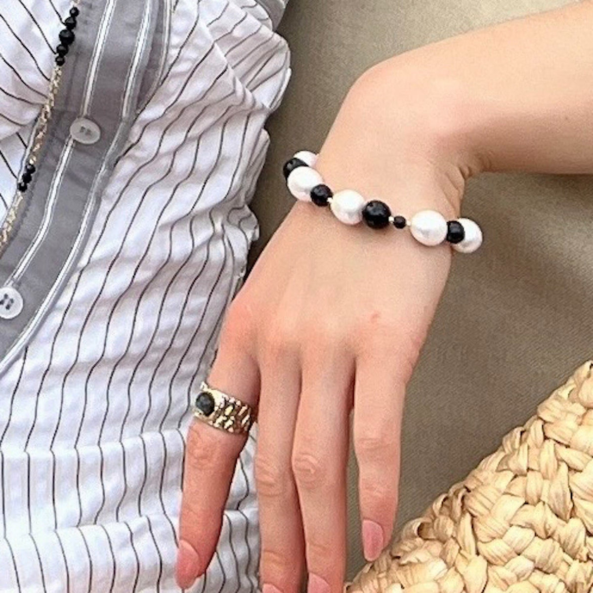 The Baroque Pearls With Black Obsidian Adjustable Bracelet by Farra is a stunning piece that combines organic elegance with a bold contrast. The irregular white baroque pearls are handpicked for their unique shape and luster, which stands out against the dark, polished black obsidian. This adjustable bracelet is versatile and can be worn alone or stacked for a personalized style.
