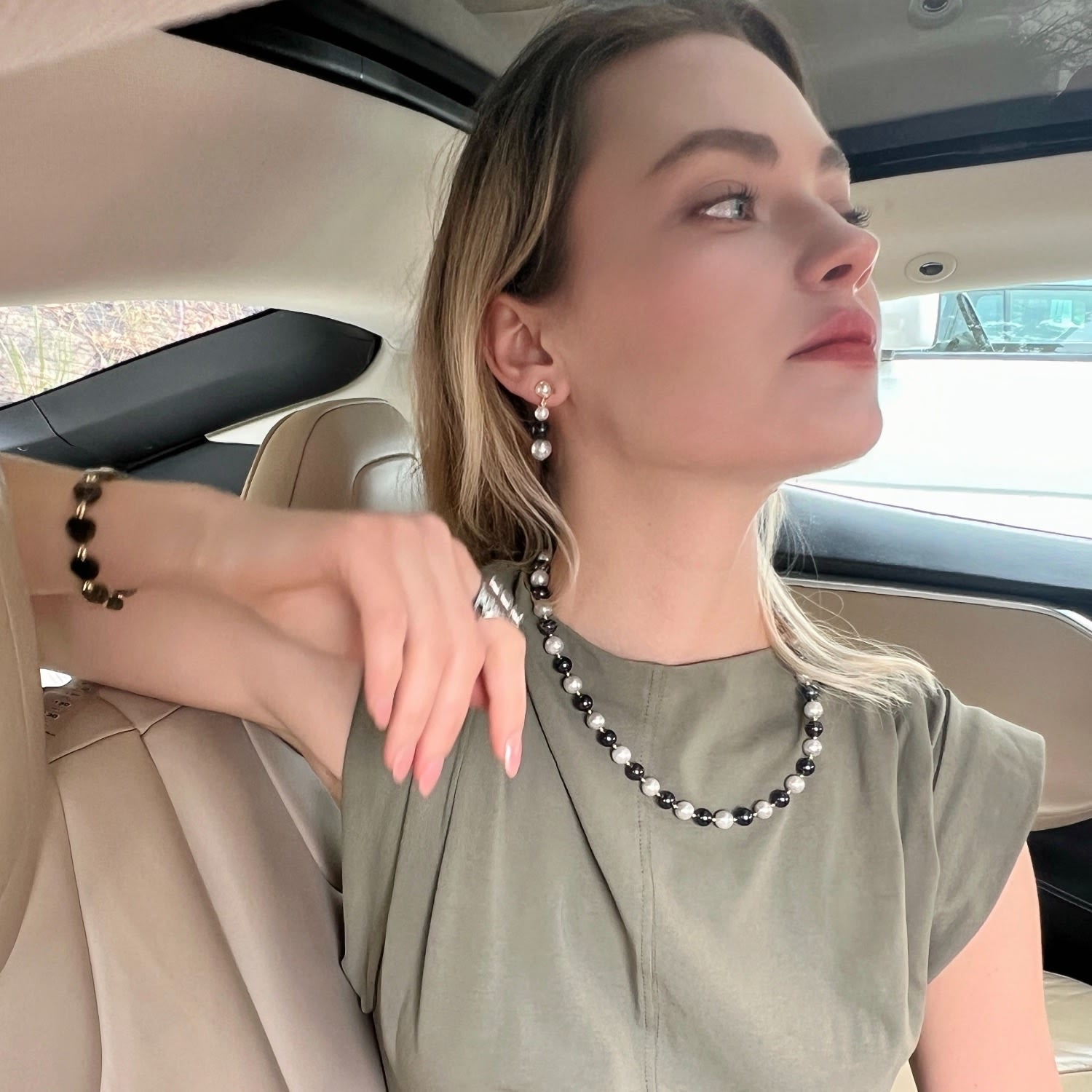 The Timeless Black Grey And White Freshwater Pearls Clip-On Earrings by Farra are a perfect blend of contrasting colors and elegant design. These earrings feature black obsidian gemstones, white freshwater pearls, and gray freshwater pearls. The clip-on style offers a convenient and comfortable option for those without pierced ears.