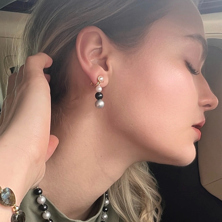 These clip-on earrings are made with white and gray freshwater pearls, natural obsidian gemstones, and 14k gold-plated brass.