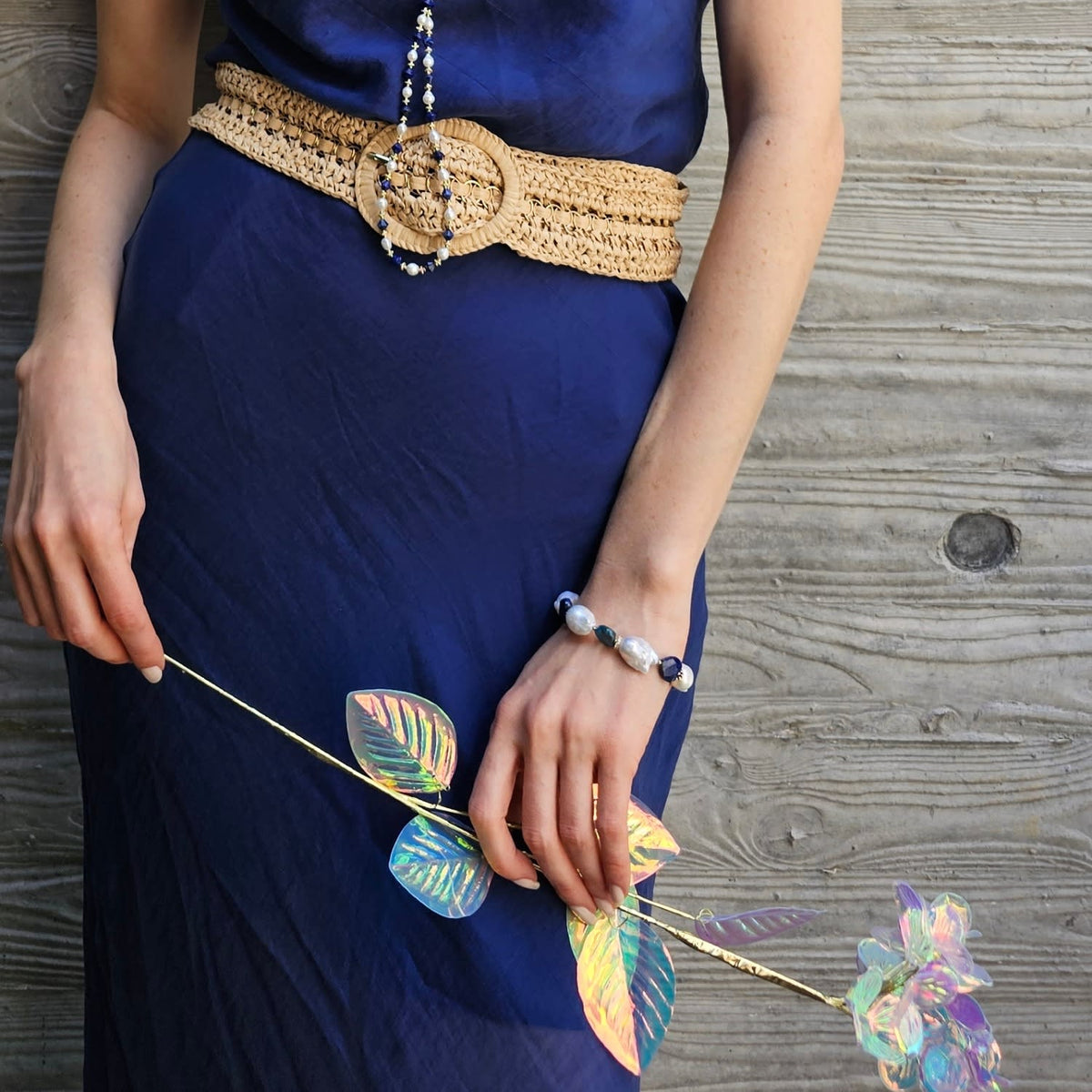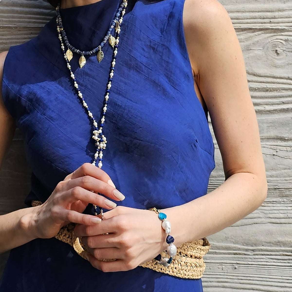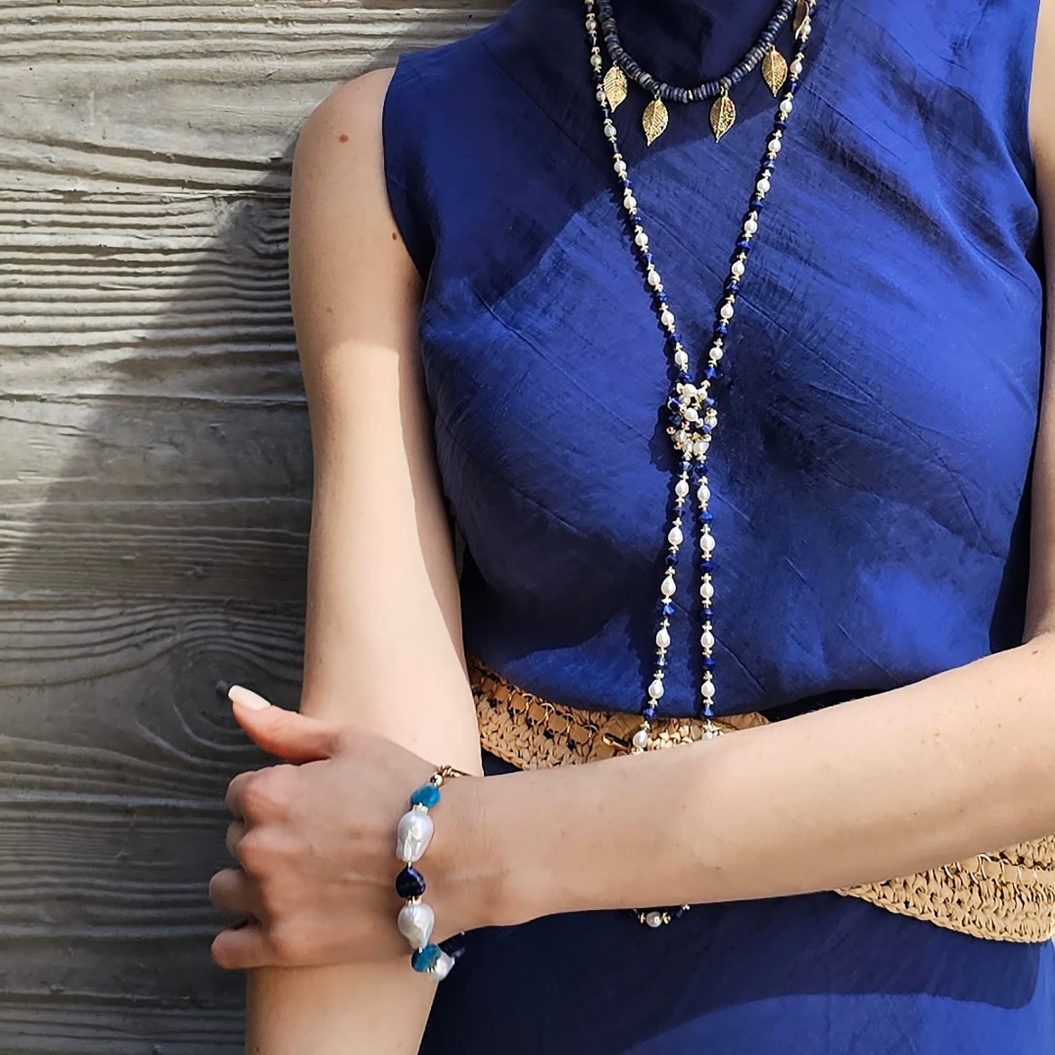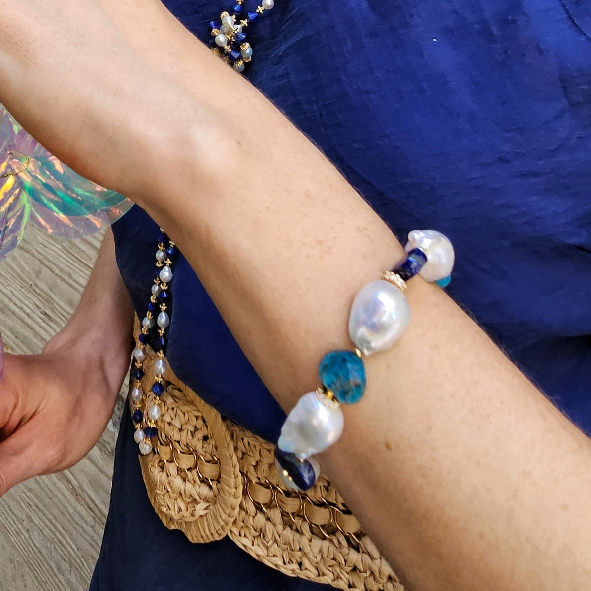 This bracelet is made of baroque pearls, heart-shaped lapis stones, and apatite accents.