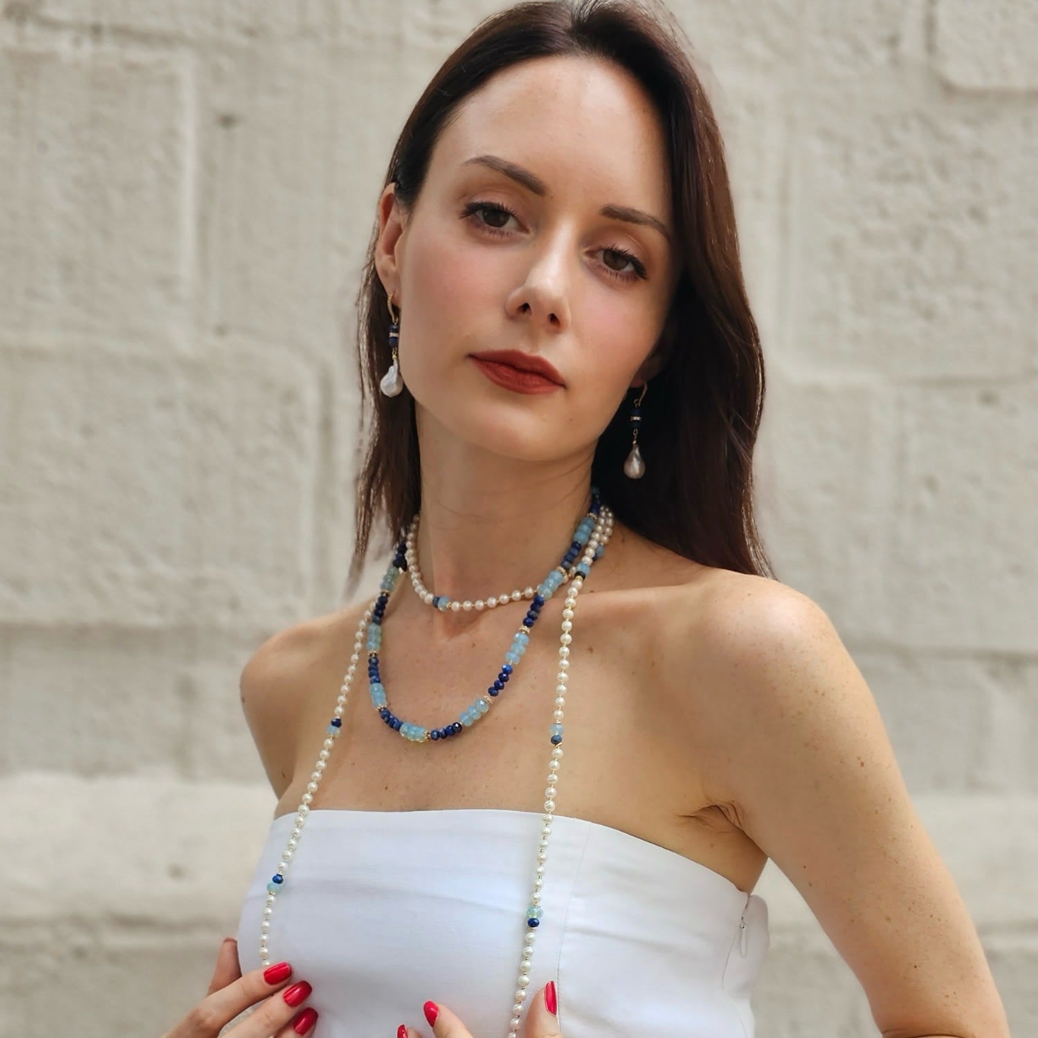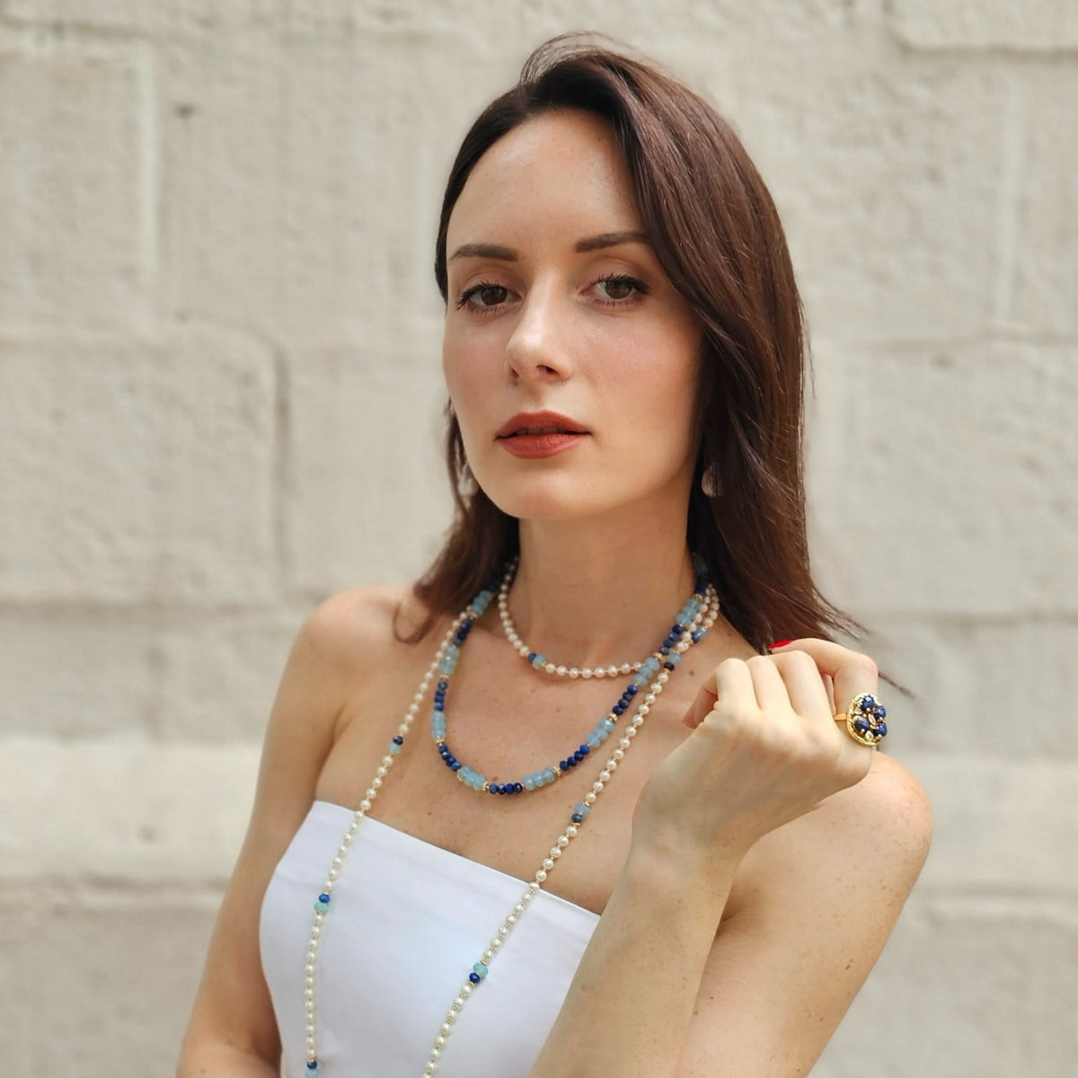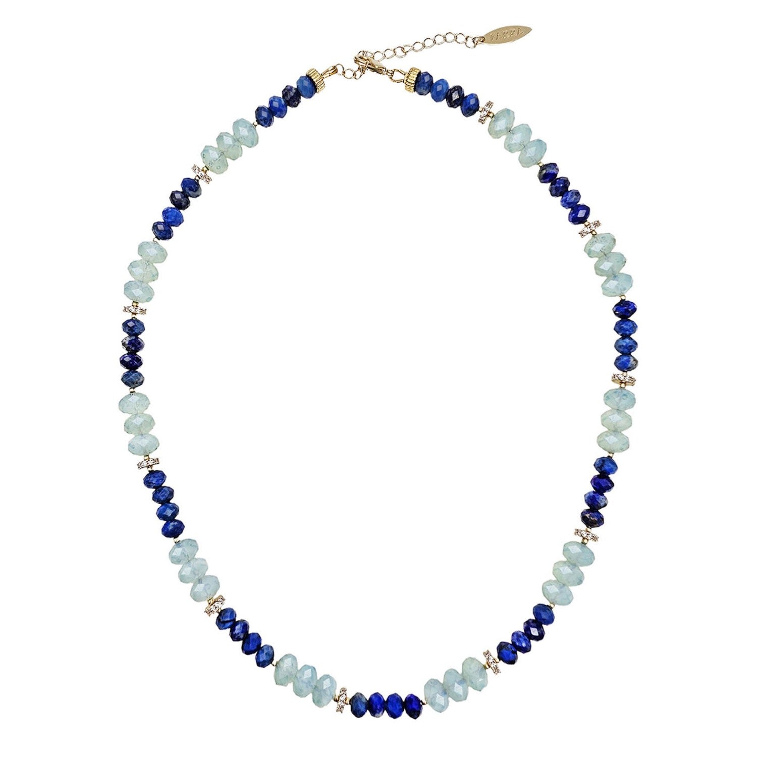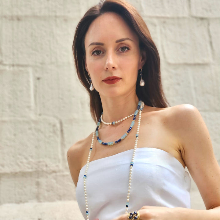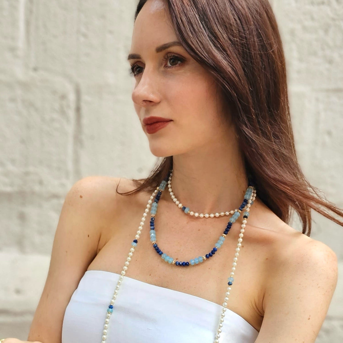 This Blue Lapis With Opal Color Matching Necklace by Farra is a captivating and meaningful accessory. The necklace features the deep blue of lapis lazuli, which fosters wisdom and emotional healing, paired with the iridescent beauty of opal, known for enhancing creativity. This piece is perfect for adding a touch of vibrant color and symbolic energy to your outfit, making it a truly captivating accessory.