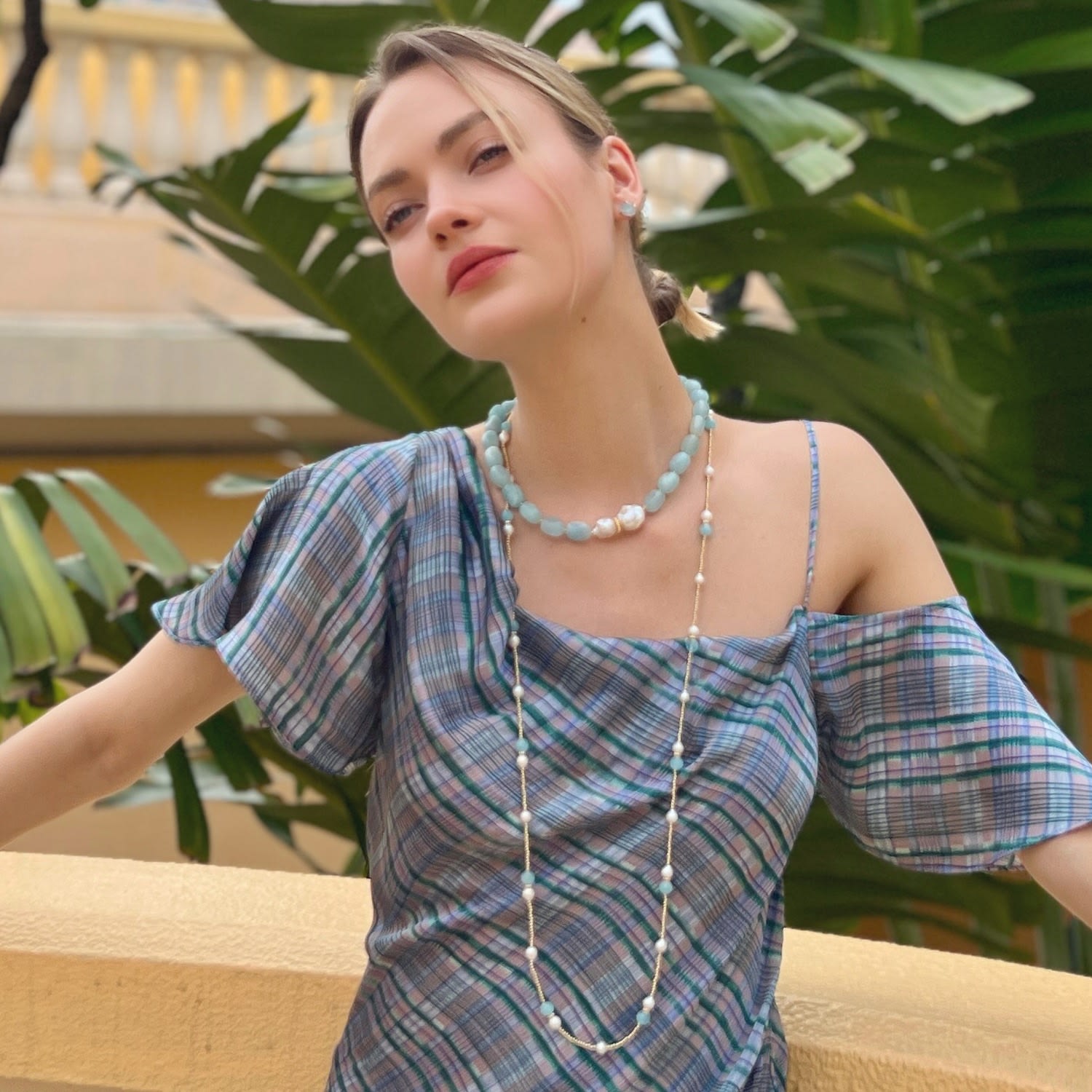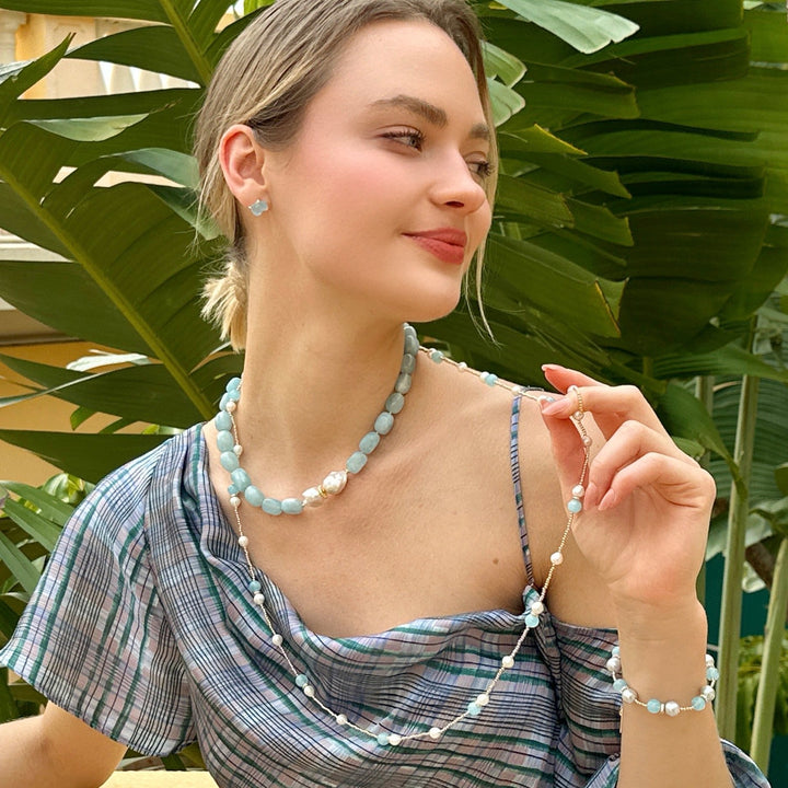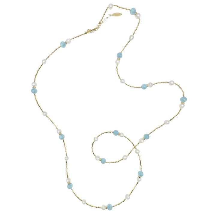 This long necklace is made with natural cultured freshwater pearls, natural aquamarine, and 14K gold-plated brass.