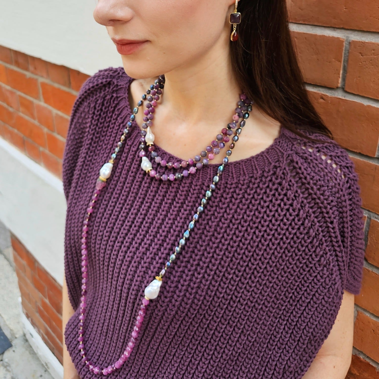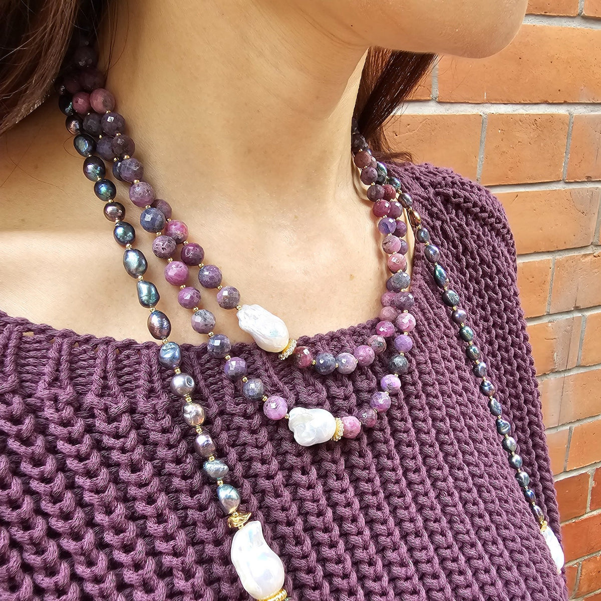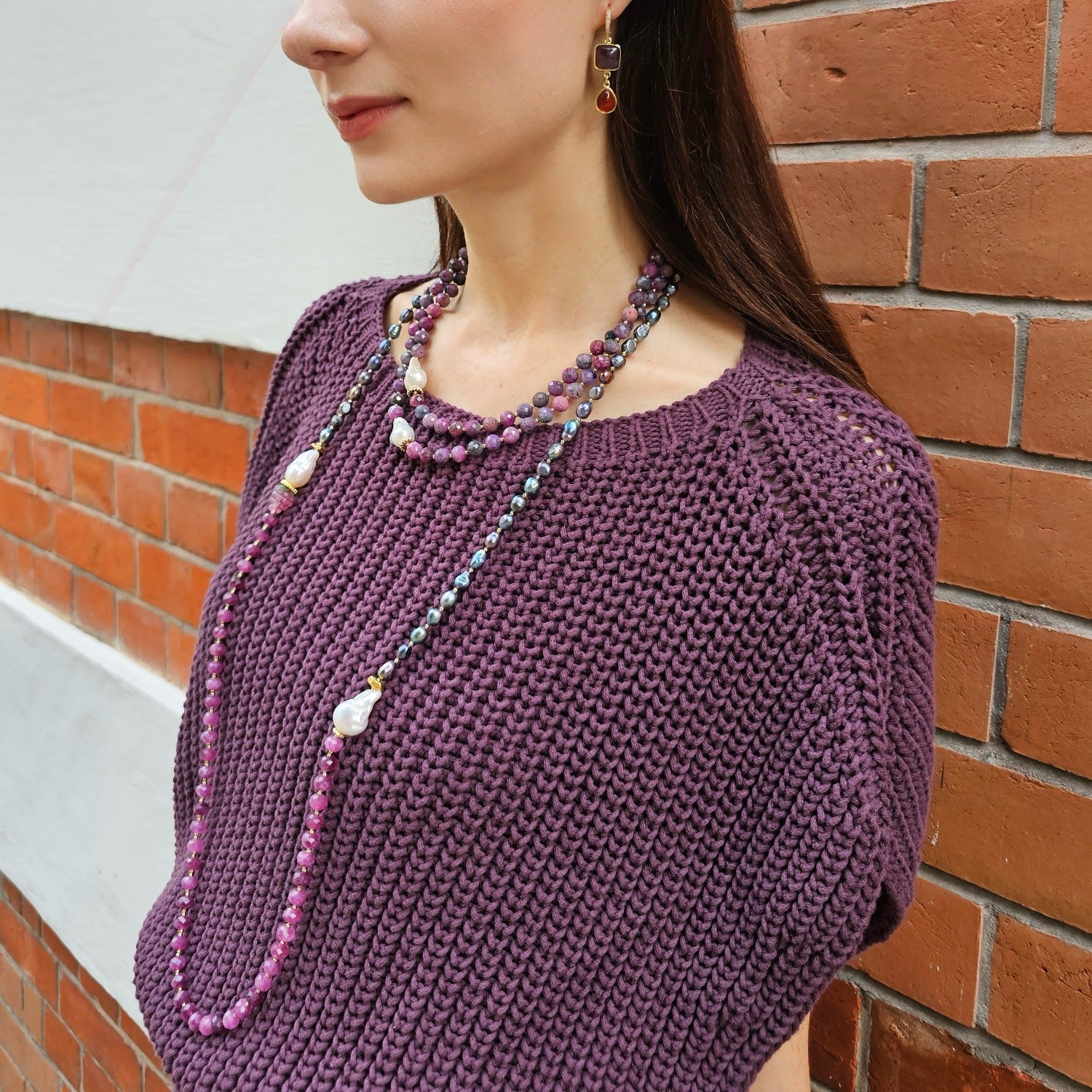 This Purple Pearls with Agate and Baroque Pearls Long Necklace by Farra is an exquisite piece that blends a rich palette of colors and textures. The combination of natural purple freshwater pearls, vibrant magenta agate, and unique baroque pearls creates a striking visual appeal. This versatile necklace can be worn as a single long strand or doubled for a layered look, allowing you to express your individuality with elegance and flair.
