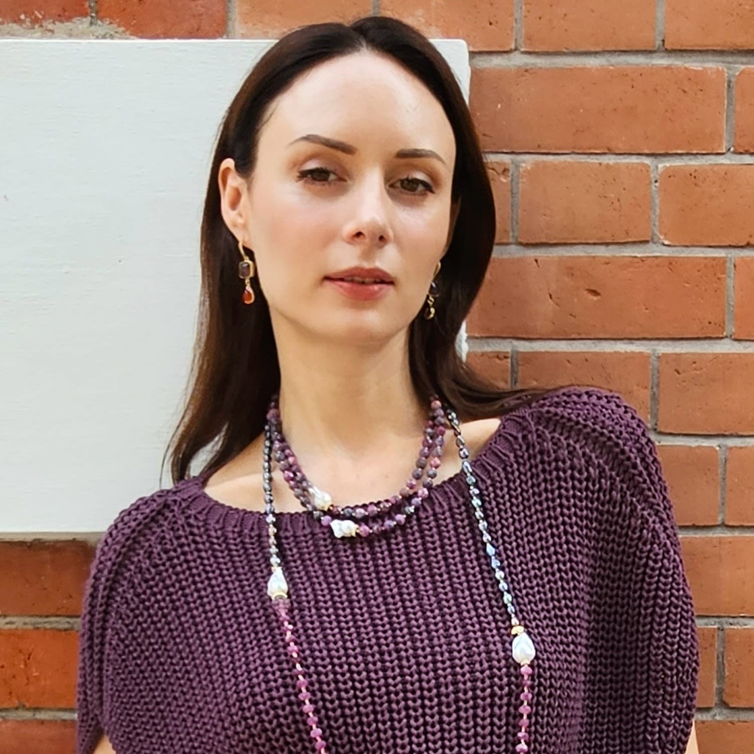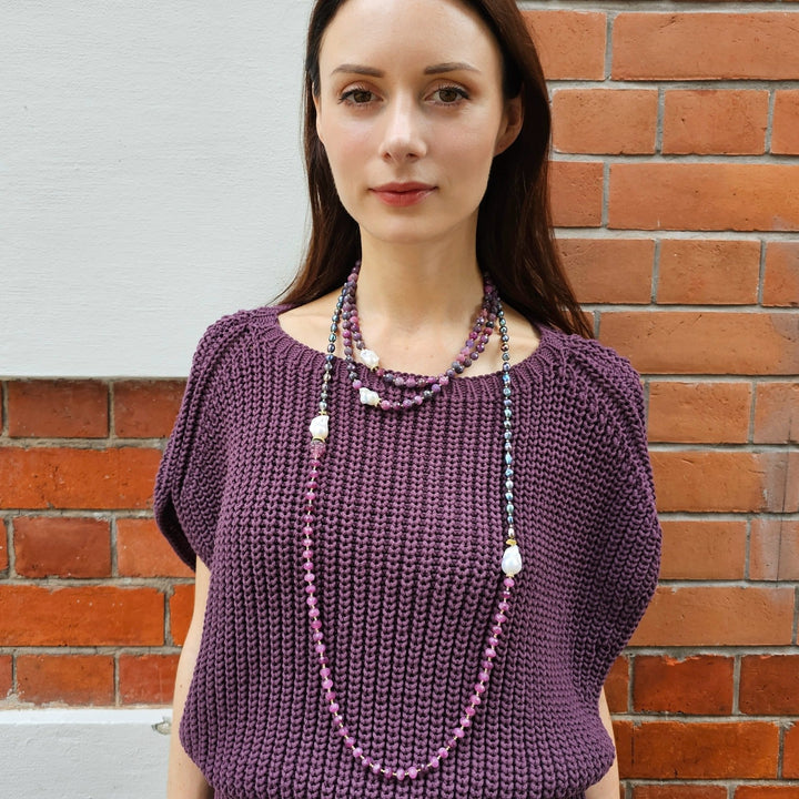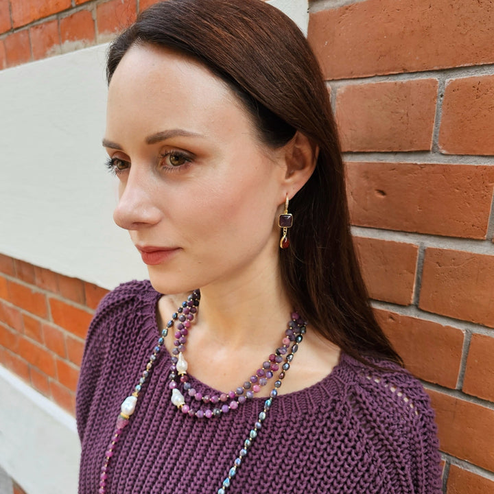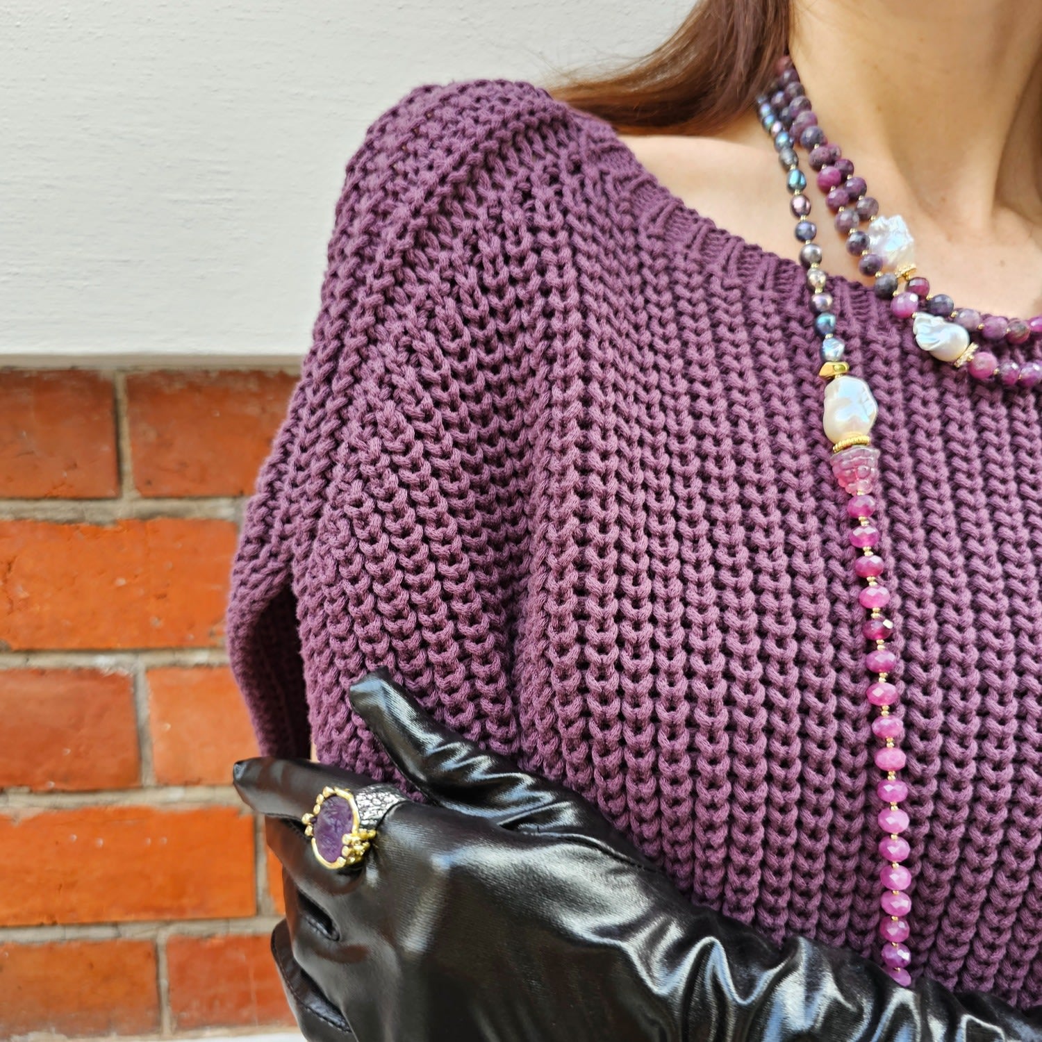 This Purple Pearls with Agate and Baroque Pearls Long Necklace by Farra is an exquisite piece that blends a rich palette of colors and textures. The combination of natural purple freshwater pearls, vibrant magenta agate, and unique baroque pearls creates a striking visual appeal. This versatile necklace can be worn as a single long strand or doubled for a layered look, allowing you to express your individuality with elegance and flair.