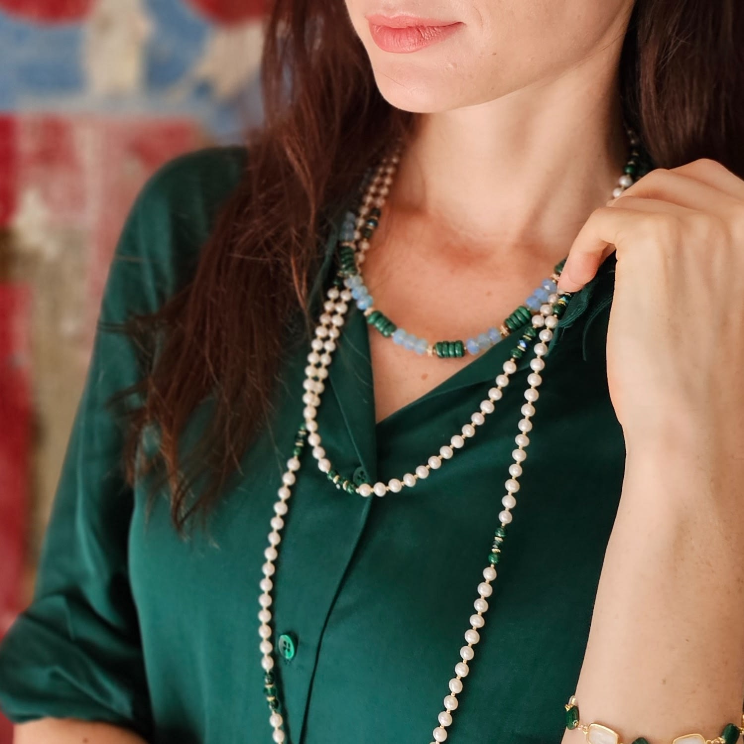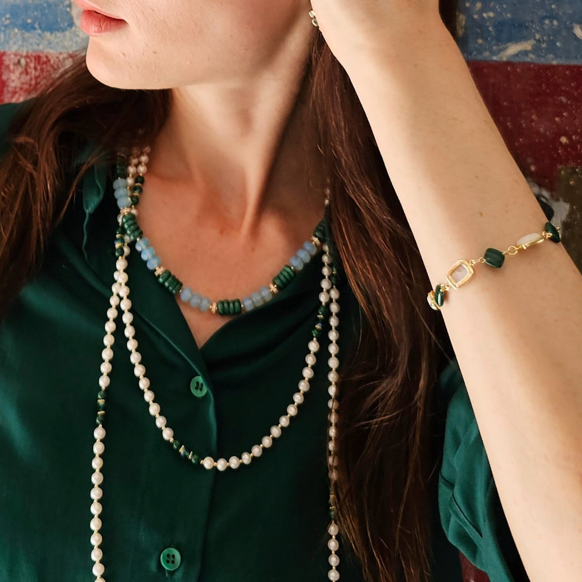 This necklace is made with natural malachite and opal. It is crafted with 14K gold-plated brass.