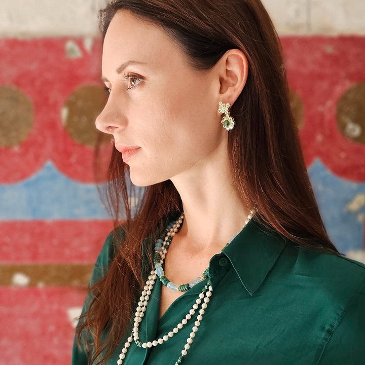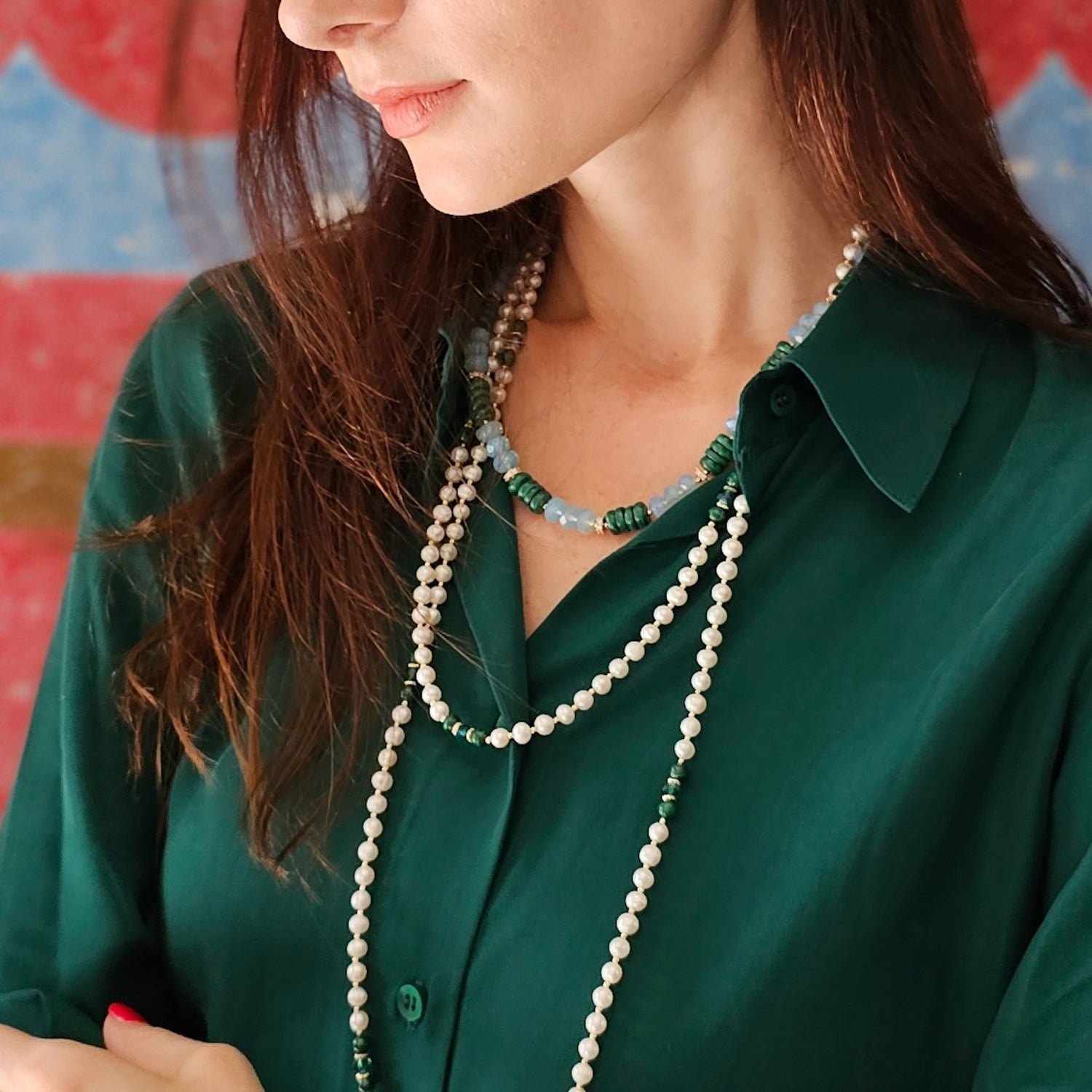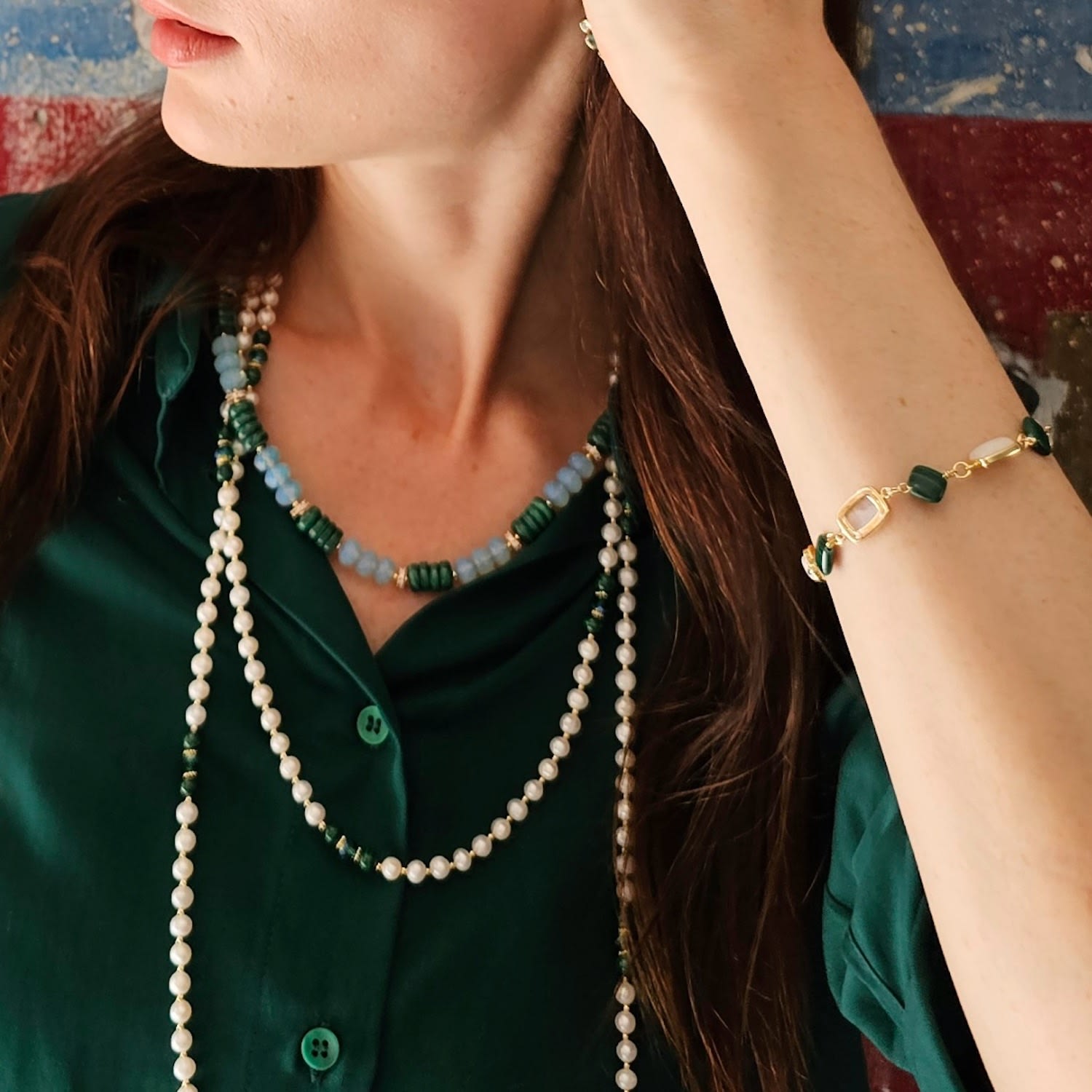 This Malachite And Opal Color Matching Necklace by Farra harmonizes the vibrant green of malachite with the iridescent hues of opal. The necklace is a visually stunning and meaningful piece, as malachite is associated with protection and opal is thought to inspire creativity.