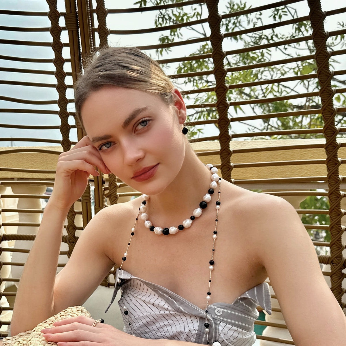 This White Baroque Pearls with Black Obsidian Chunky Necklace by Farra is a captivating and versatile accessory. The irregular-shaped white baroque pearls are selected for their distinct individuality and natural beauty, creating a stunning contrast against the dark black obsidian gemstones. This chunky necklace effortlessly elevates both casual and formal outfits, adding an element of sophistication and artistic glamour to your look.