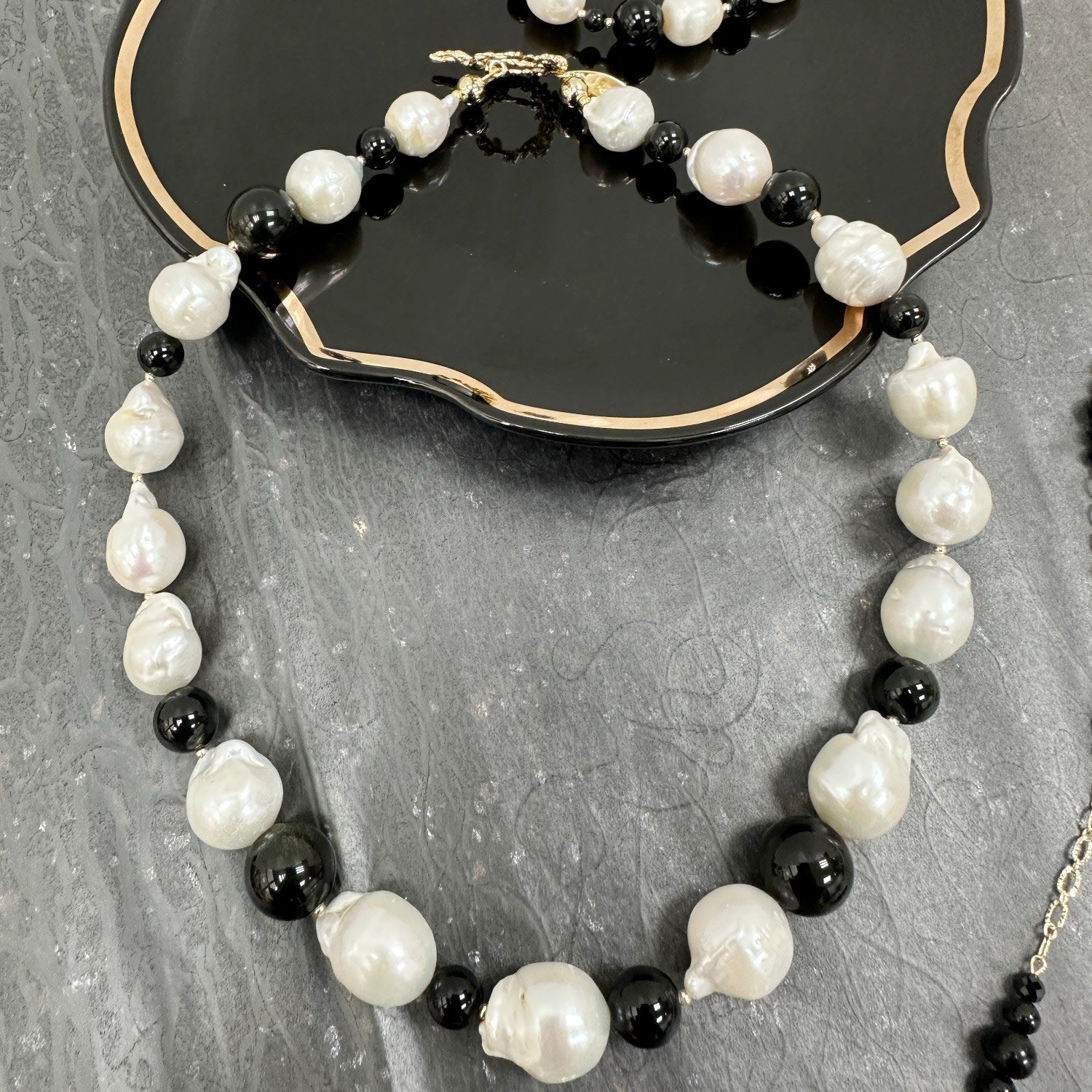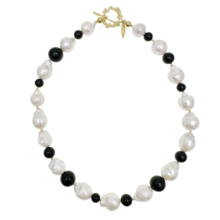 This chunky necklace features natural baroque freshwater pearls and black obsidian gemstones.