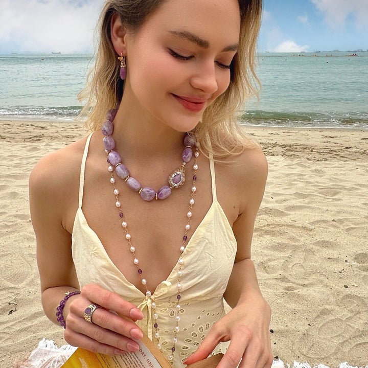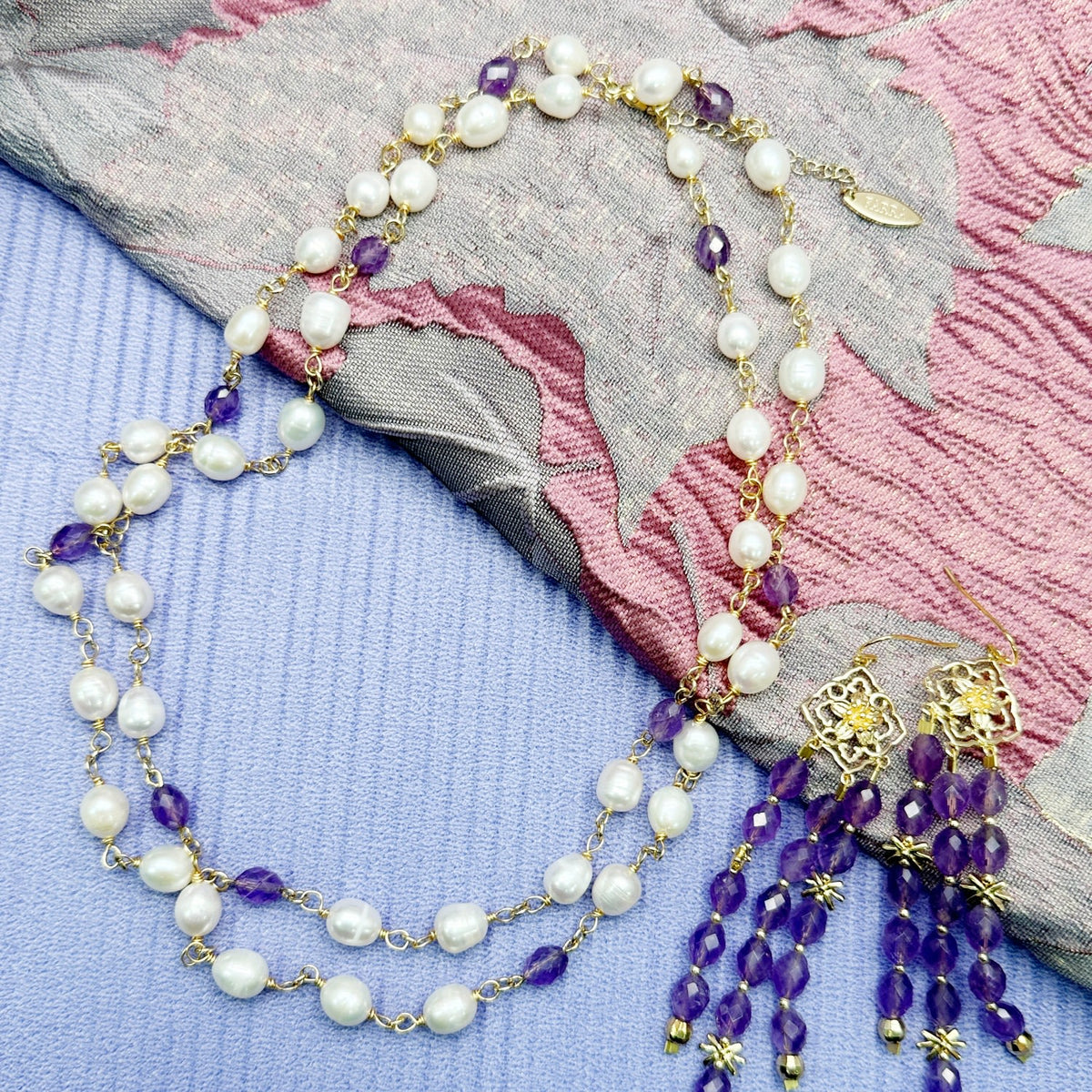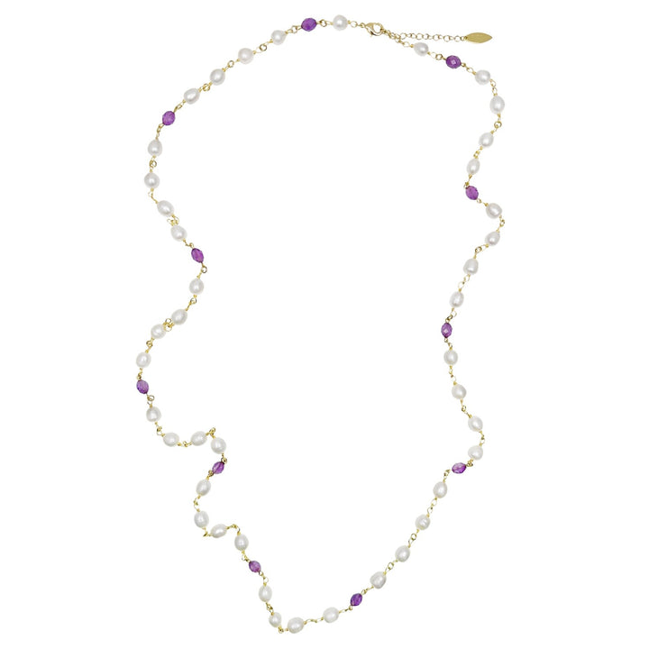 This long necklace features freshwater pearls and natural amethyst on a 14K gold-plated brass base.