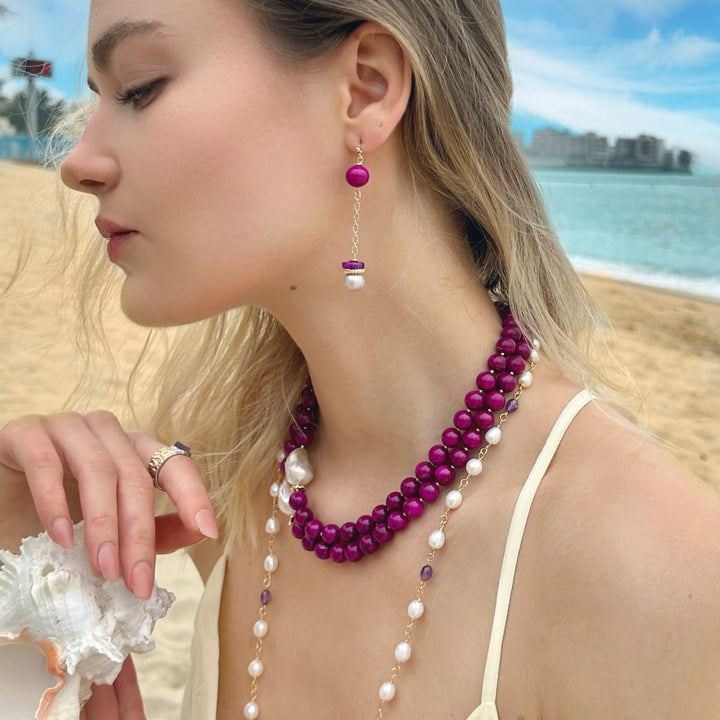 This Freshwater Pearls With Purple Amethyst Long Necklace by Farra is a timeless and versatile accessory. The long necklace features lustrous freshwater pearls and purple amethyst accents. The generous length allows for versatile styling—wear it as a long single strand for an elegant, elongating effect or double it for a layered look. This necklace adds a touch of sophistication to both formal and casual ensembles.