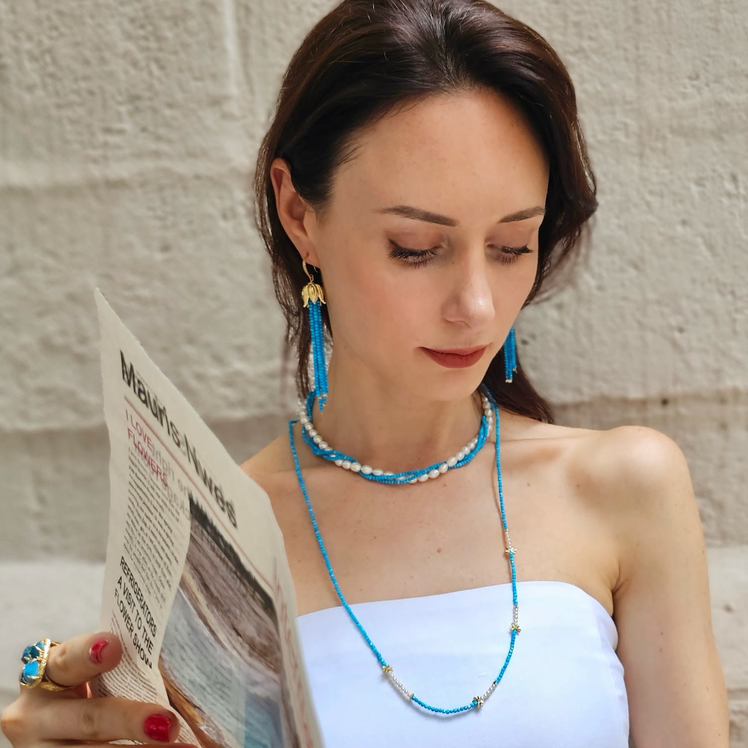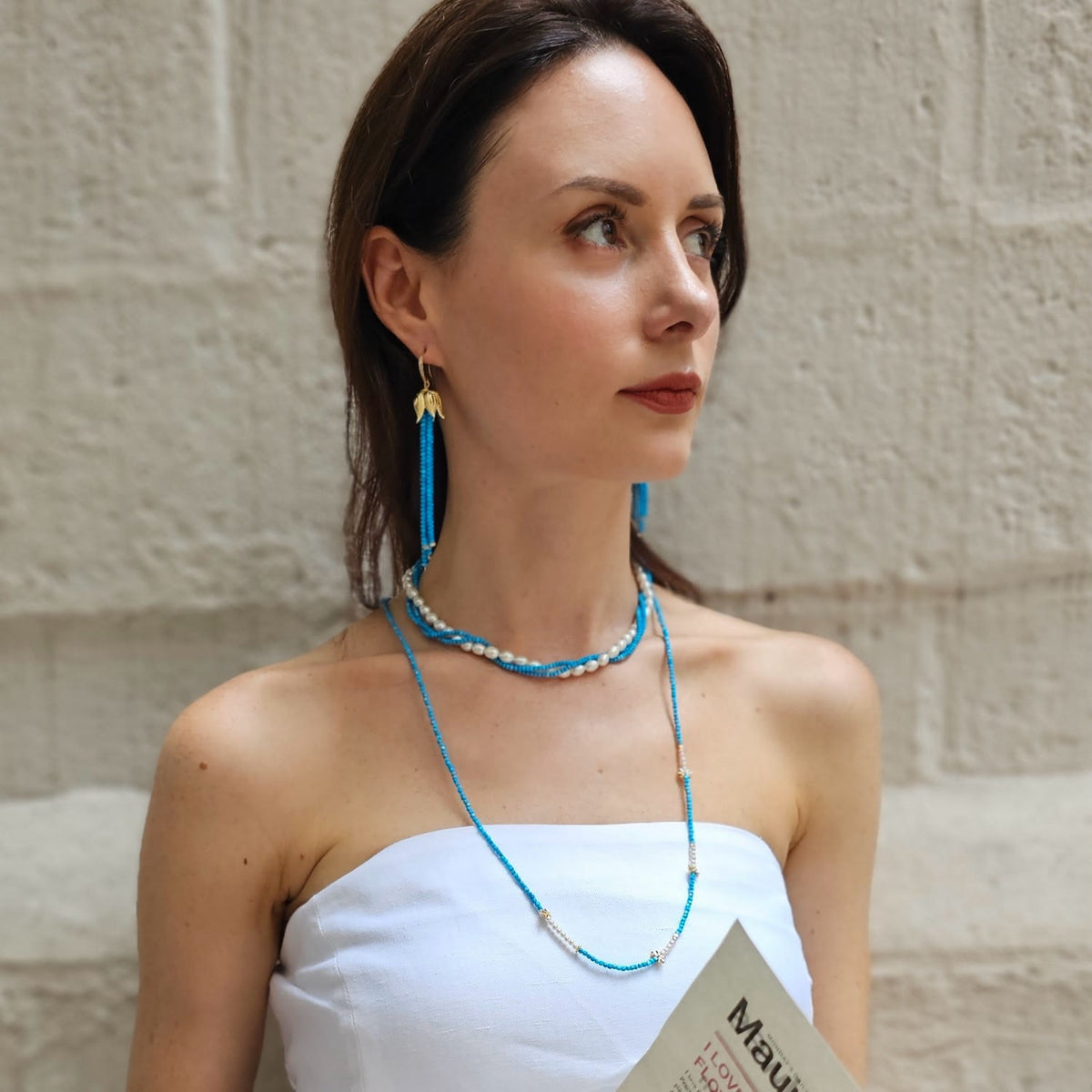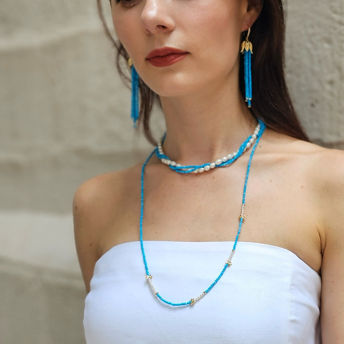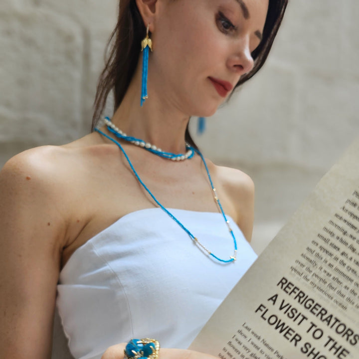 This necklace is made with freshwater pearls and natural turquoise on 14K gold-plated brass.