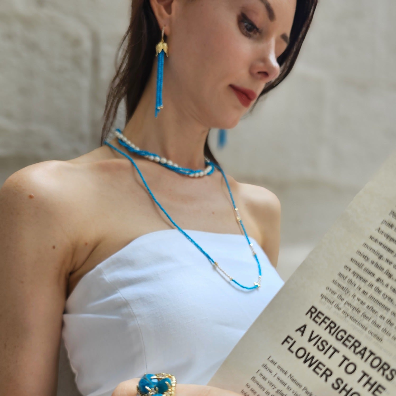 This Freshwater Pearls With Blue Turquoise Twisted Necklace by Farra is a striking accessory that marries classic and contemporary style. The twisted design beautifully showcases the vibrant blue turquoise stones, which symbolize tranquility and protection, in stunning contrast with the soft, luminous freshwater pearls. Its luxurious yet versatile aesthetic makes it a meaningful and fashionable gift for any occasion.