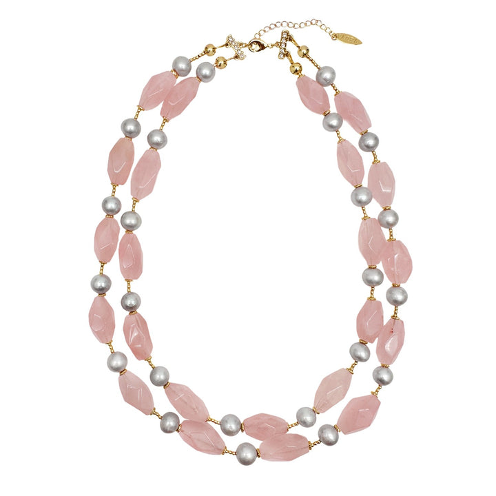 This double-layered necklace is crafted from 14-karat gold-plated brass. It features natural rose quartz gemstones and natural gray-colored freshwater pearls.
