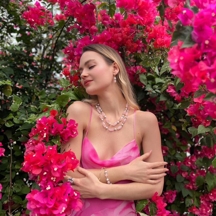 This Pink Rose Quartz And Gray Freshwater Pearls Double Layers Necklace by Farra is a striking piece that showcases a beautiful harmony between feminine charm and classic sophistication. It effortlessly combines the enchanting allure of faceted pink rose quartz—the "Stone of Love"—with the lustrous elegance of gray freshwater pearls. The design creates a dazzling display of soft pink and gray hues, infusing the wearer with a sense of warmth, compassion, and positive energy.