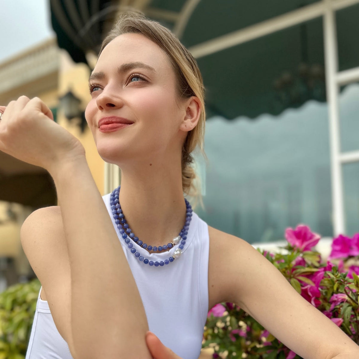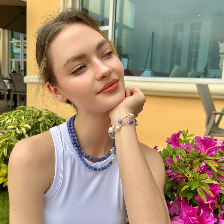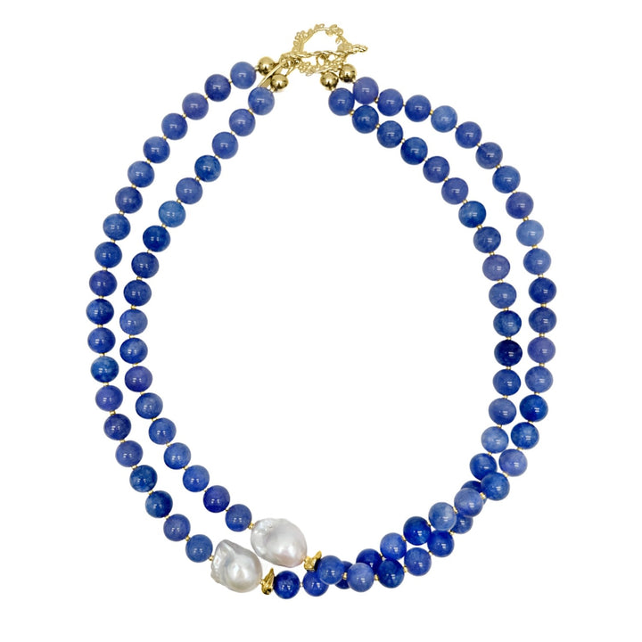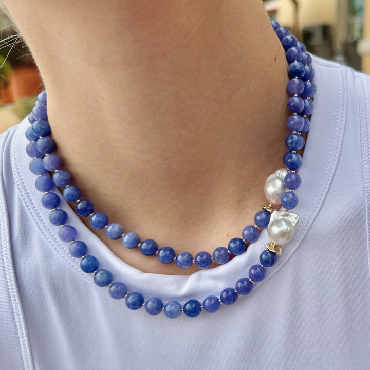 This double-layered necklace is made with natural blue jade beads and natural cultured freshwater baroque pearls. The metal is 14-karat gold-plated brass.