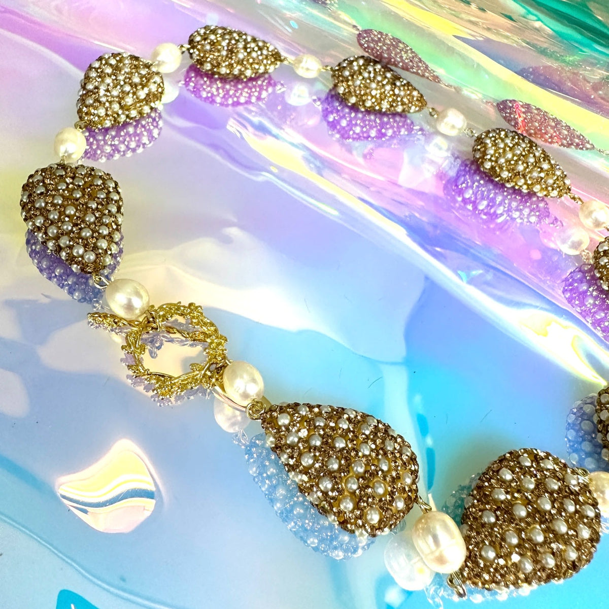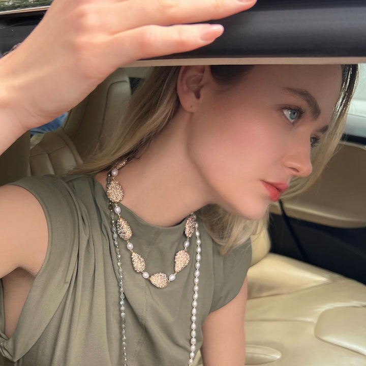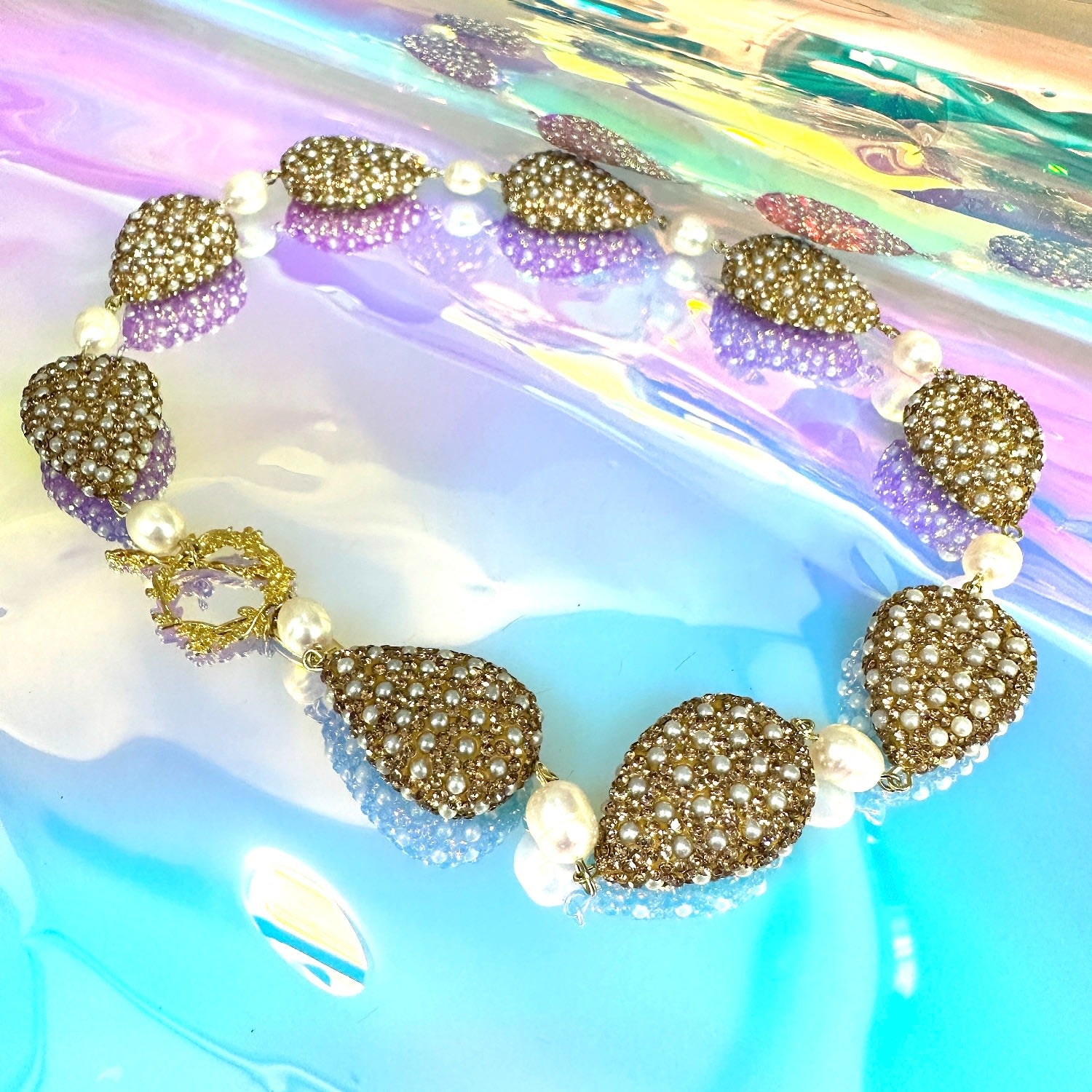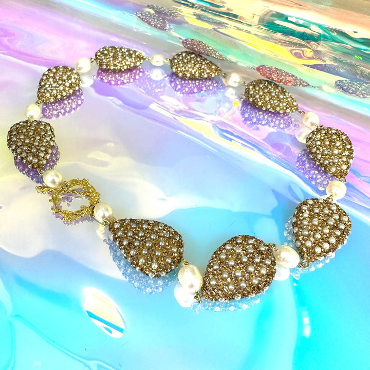 This choker necklace is made from rhinestones, natural freshwater pearls, and 14-karat gold-plated brass.