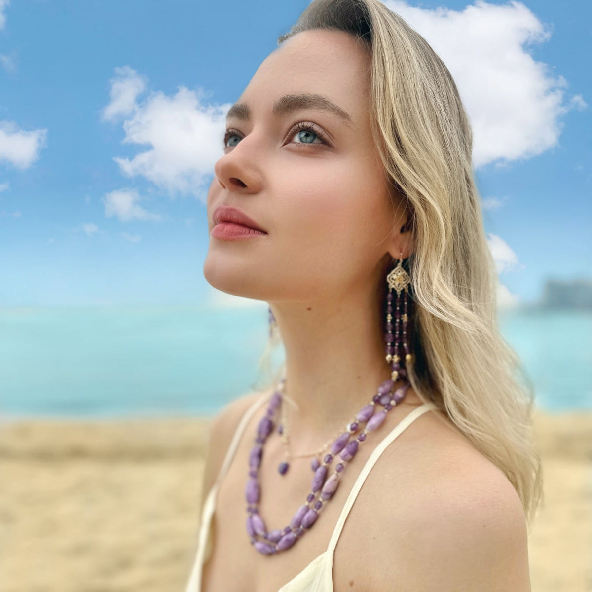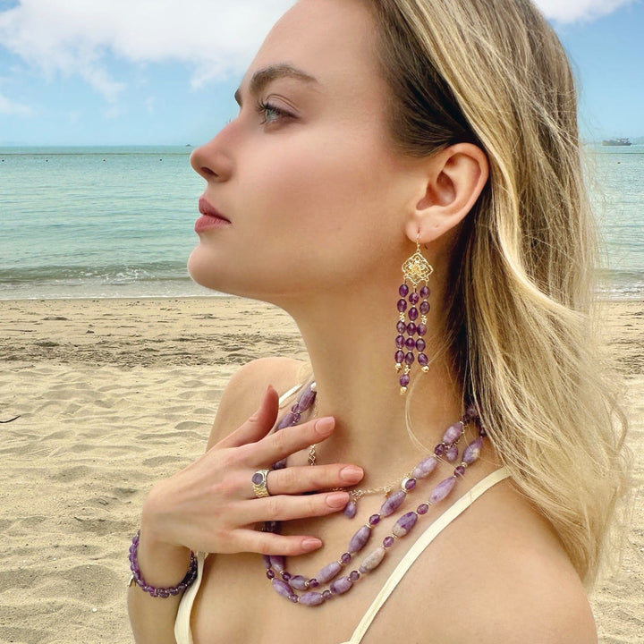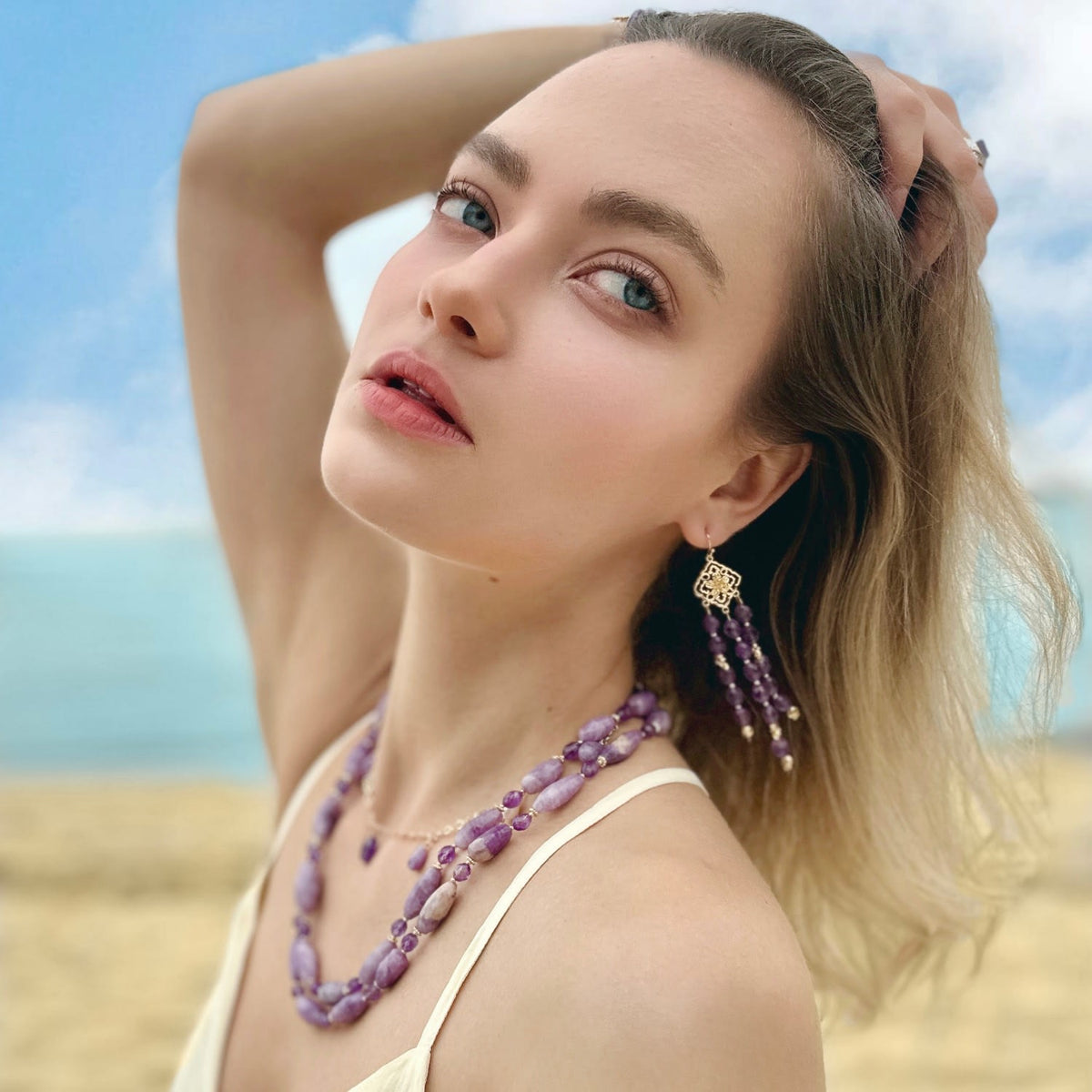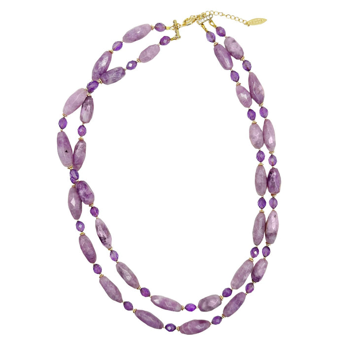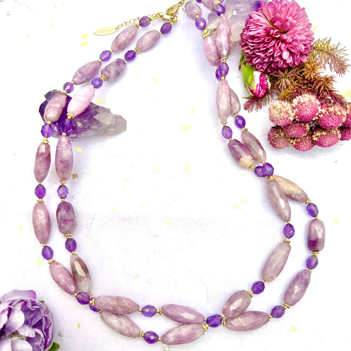 The Double Layers Purple Gemstone Necklace by Farra is an exquisite choker necklace. It features a captivating combination of oval phosphosiderite and amethyst gemstones. The double-layer design adds dimension and sophistication. The varying shapes and sizes of the gemstones add an artistic flair, making it a versatile piece for formal or everyday wear.