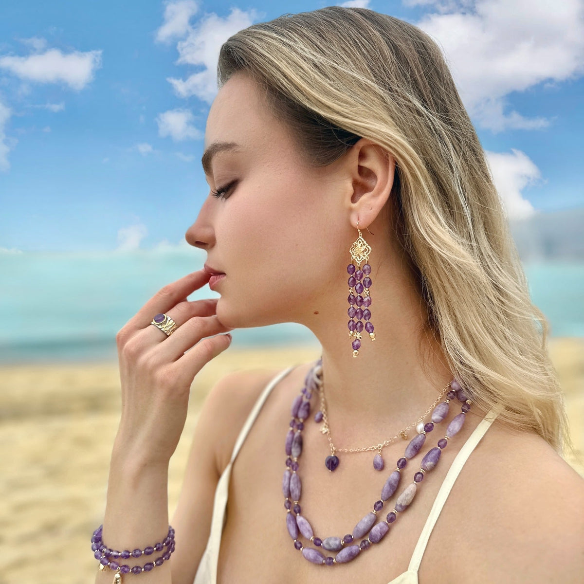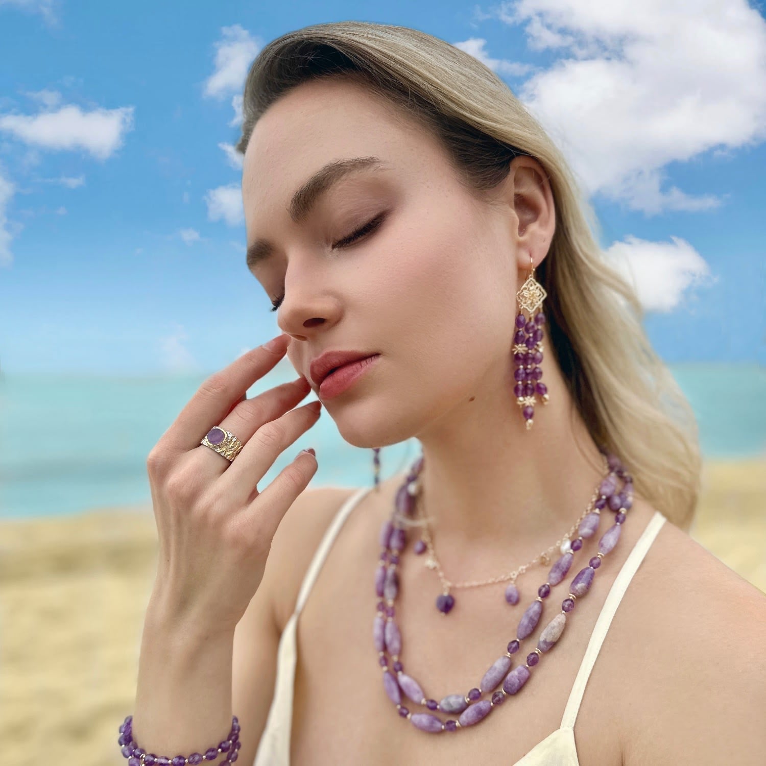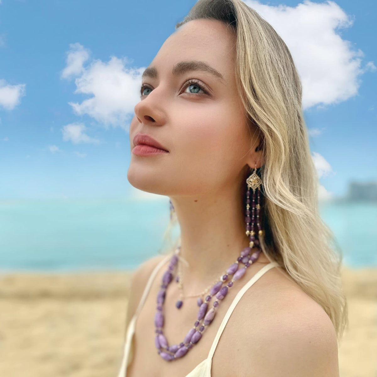 The Double Layers Purple Gemstone Necklace by Farra is an exquisite choker necklace. It features a captivating combination of oval phosphosiderite and amethyst gemstones. The double-layer design adds dimension and sophistication. The varying shapes and sizes of the gemstones add an artistic flair, making it a versatile piece for formal or everyday wear.