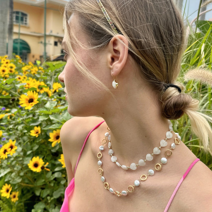 This choker necklace is made with a natural heart-shaped moonstone and 14-karat gold-plated brass. It has a magnetic clasp.
