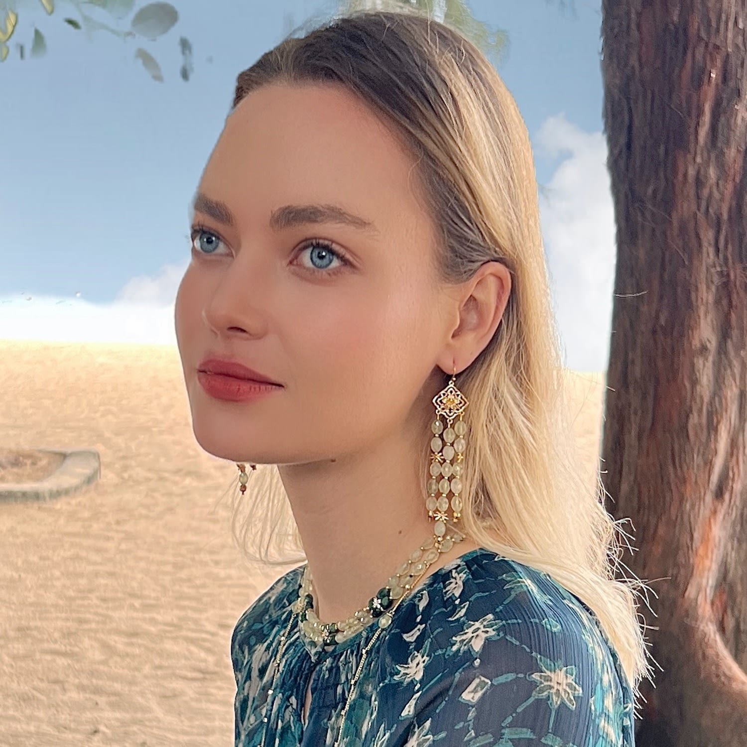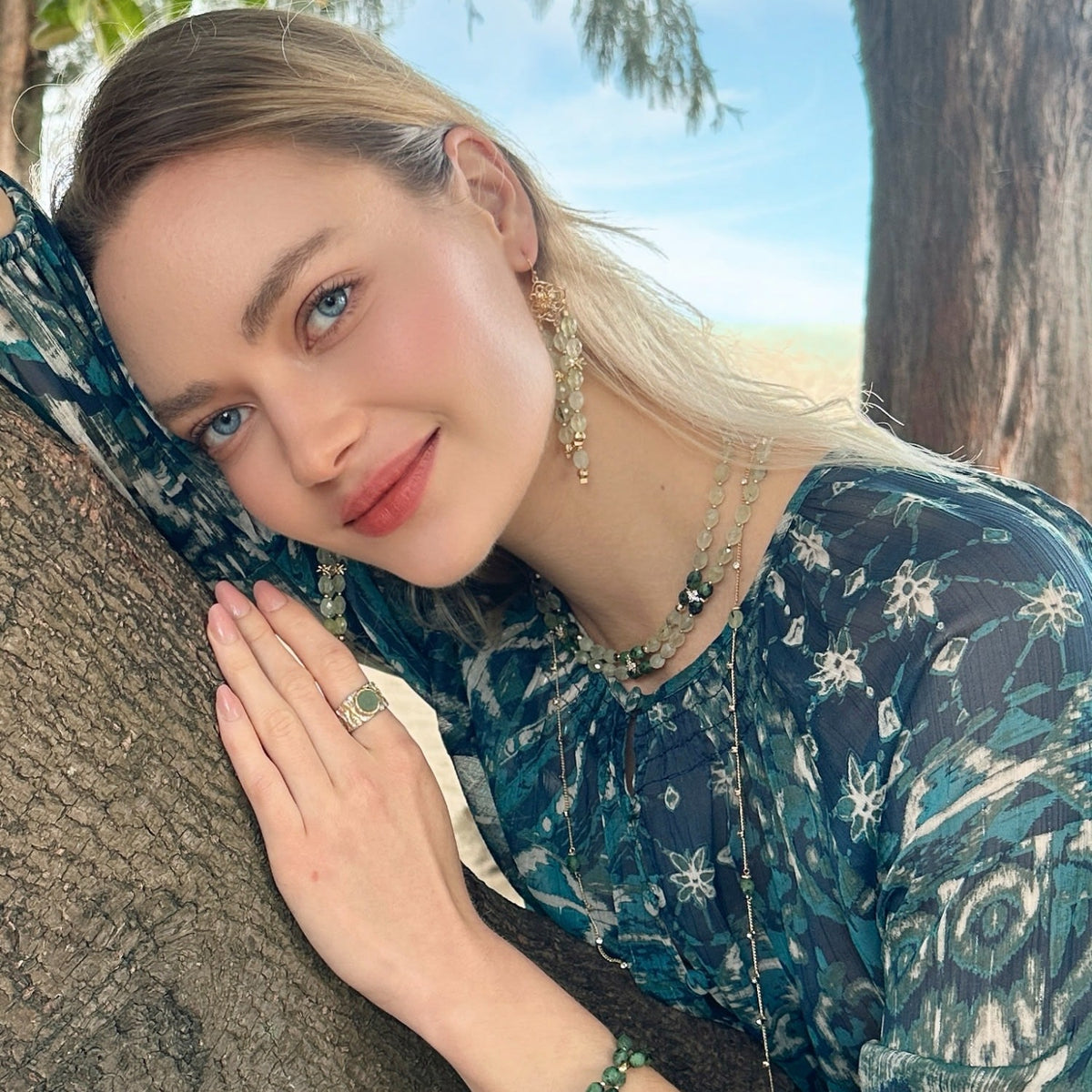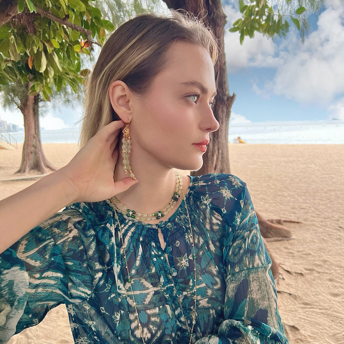 This necklace is crafted from 14K gold plated brass and features natural prehnite and zircon stones.
