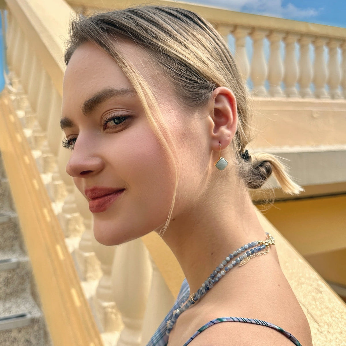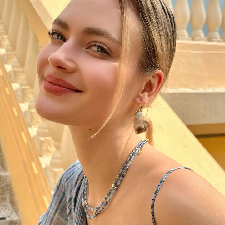 This necklace is made with natural kyanite gemstone, zircon stone, and 14K gold-plated brass.