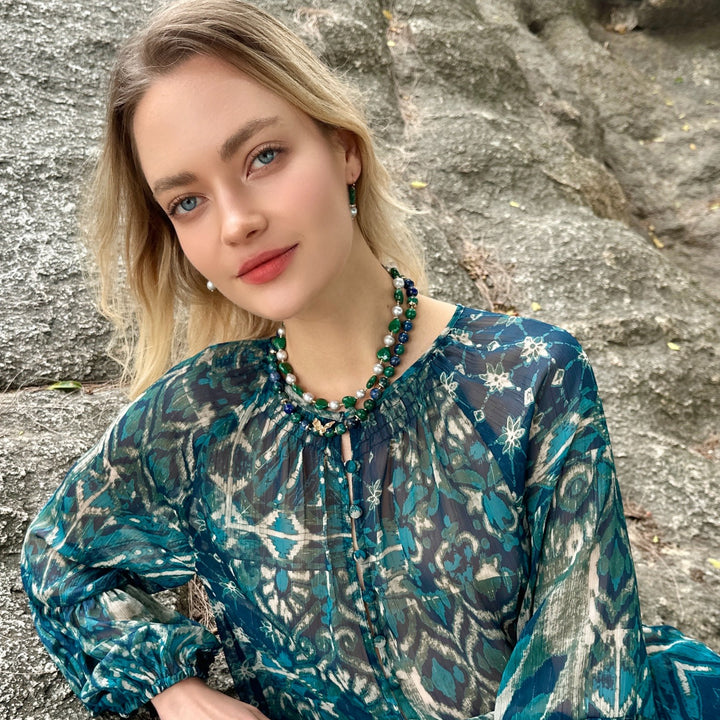 The Heart-Shaped Malachite With Gray Freshwater Pearls Statement Necklace by Farra is a stunning and elegant accessory. The deep green, natural patterns of the malachite are beautifully complemented by the soft gray hue of the freshwater pearls. The heart shape adds a touch of romance, making this necklace not only a beautiful piece of jewelry but also a heartfelt gesture.