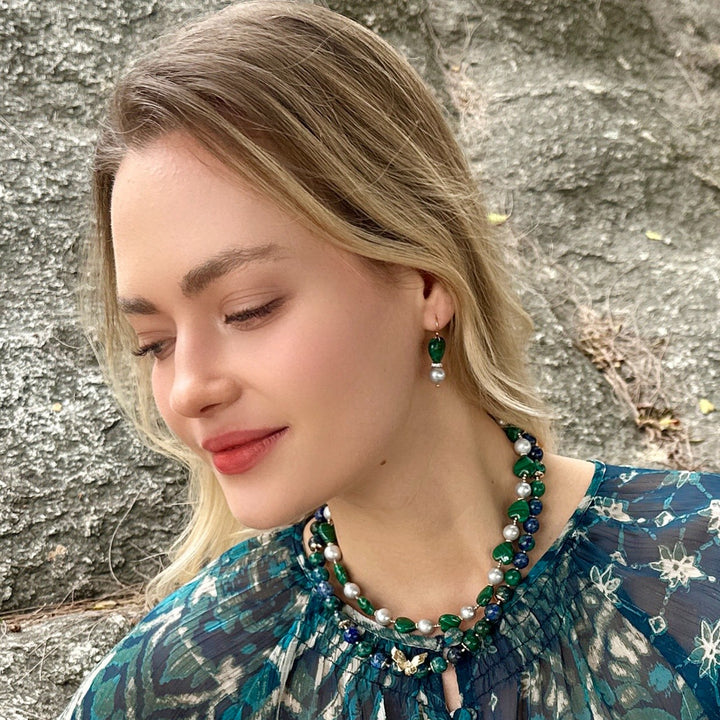 This necklace is made with natural malachite, gray cultured freshwater pearls, and 14K gold-plated brass.